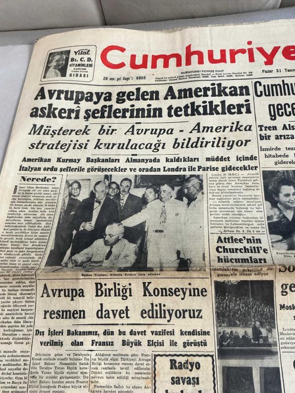 CUMHURİYET GAZETESİ -31 TEMMUZ 1949-CUMHUR BAŞKANI DÜN İZMİRE VARDI-YWNİ İLLER KANUNU-AMERİKAN FİLOSU YARIN GİDİYOR-AVRUPA BİRLİĞİ KONSEYİNE DAVET EDİLİYORUZ -TÜRK ELİŞLERİ SERGİSİ-ATOM BOMBASI VEYA SIRRI İNGİLTEREYE VERİLMELİMİDİR-DR FAHRİ CELAL-DR ŞEMSİ MUTVER-DOKTOR ZİYAEDDİN MAKTAV-ÜROLOG DOKTOR BAHAEDDİN LÜTFİ -DİŞ TABİBİ NECDET RIFAT ATAY -DR SEDAD KUMBARACILAR - adlı eser, Kitap > Süreli Yayınlar > Gazeteler > Türkiye > Genel > Günlük kategorisinde İkinci El olarak satıştadır.