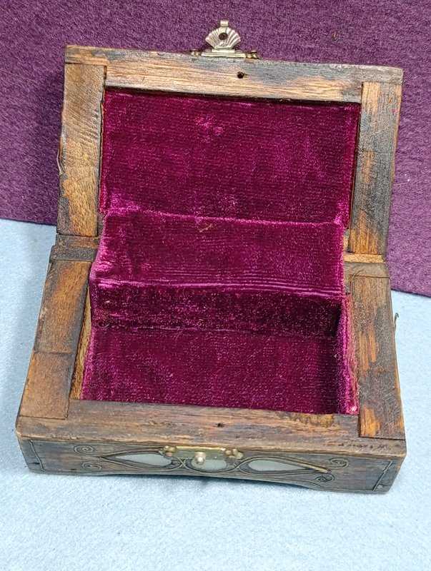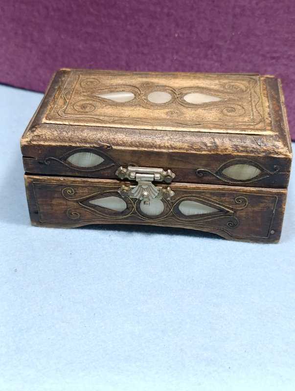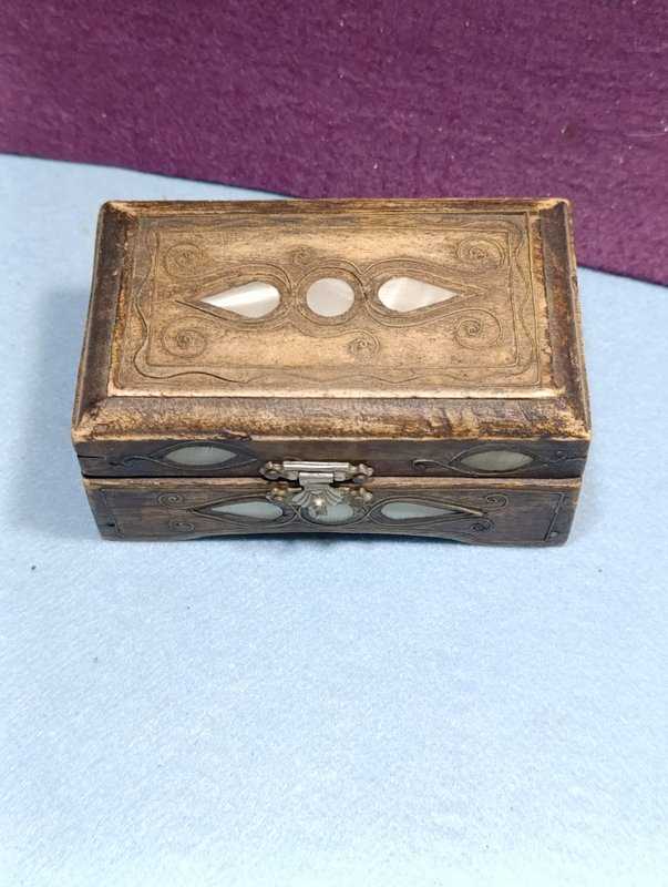 ÇY5----SEDEF VE PİRİNÇ DEKORLU ESKİ AHŞAP TAKI-MÜCEVHER KUTUSU başlıklı antika/koleksiyon objesinin menşei belirtilmemiştir. Objenin ait olduğu dönem bilinmeketedir.
