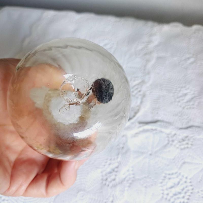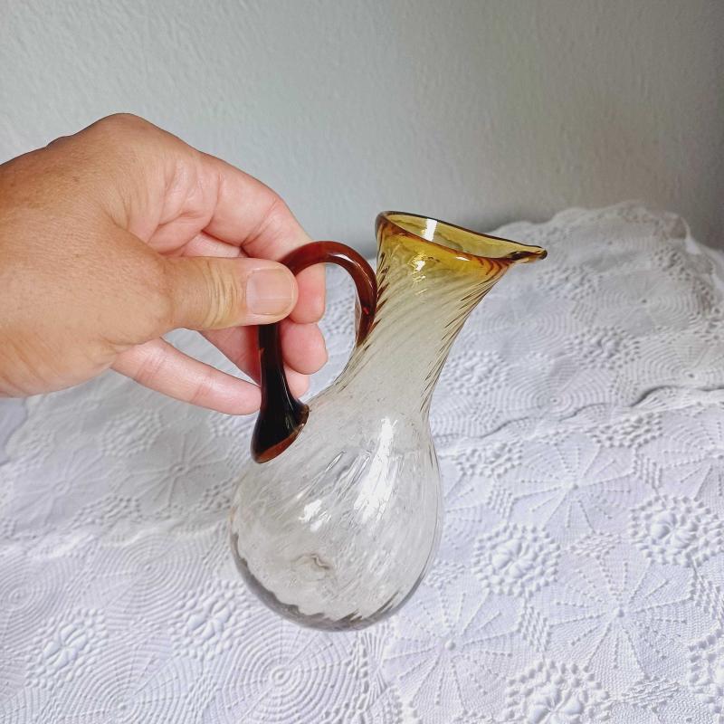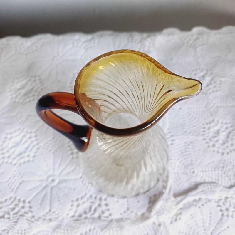 Harika bir gagali cam karaf. Harika geçisli amber ton. Kulplu. Sarmal dokulu. El yapimi. Kopartma cam.(bkz taban fotosu)