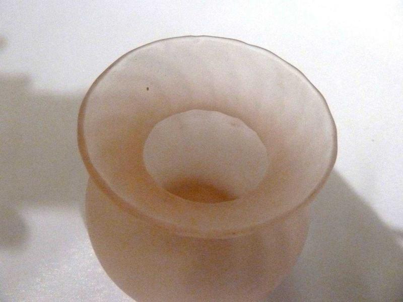 Cam vazo pembe, boğumlu, geniş ağızlı Y:8,5cm başlıklı antika/koleksiyon objesinin menşei belirtilmemiştir. Objenin ait olduğu dönem bilinmeketedir.