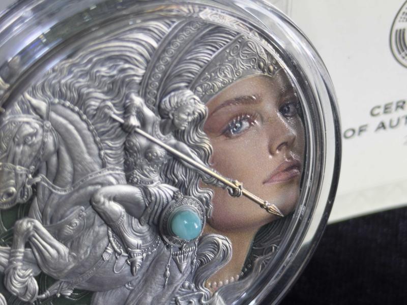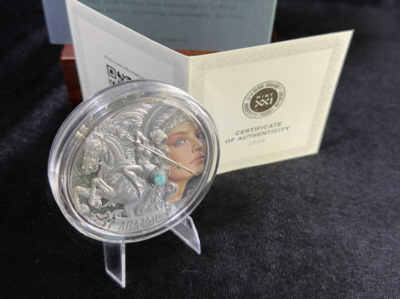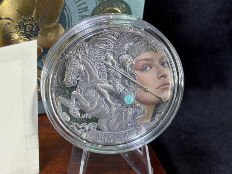 Kamerun 2024 Amazon Femina Bellator Gümüş Sikke – 2 oz .999 (500 Adet Limitli) Amazon Femina Bellator gümüş sikke, antik çağın en etkileyici kadın savaşçı figürlerinden biri olan Amazonları merkezine alan, yüksek sanatsal ve nümismatik değere sahip özel bir koleksiyon eseridir. Yalnızca 500 adet ile sınırlandırılmış üretimi sayesinde, tematik gümüş sikkeler arasında seçkin ve zor bulunan bir konuma sahiptir. Amazonlar; Karadeniz çevresi, Kafkasya ve Anadolu coğrafyasıyla ilişkilendirilen, okçuluk, binicilik ve yakın dövüşte üstün yetenekleriyle efsaneleşmiş savaşçılar olarak bilinir. Bu sikke, Amazonları yalnızca savaşçı kimlikleriyle değil; özgürlük, bağımsızlık ve kararlılık sembolleri olarak da yorumlayan güçlü bir sanatsal anlatım sunar. Ön yüzde yer alan Amazon figürü, yüksek rölyef tekniğiyle derinlik kazanmış; yüz ifadesi, zırh ve silah detayları son derece ince işçilikle tasarlanmıştır. Kompozisyonun merkezinde kullanılan amazonit taş kakma, Amazonların doğayla olan bağını ve ruhsal gücünü simgelerken sikkeye benzersiz bir karakter kazandırır. Dijital baskı tekniği sayesinde figür detayları klasik gümüş yüzeyden ayrışarak etkileyici bir görsel etki oluşturur. Arka yüzde ise Amazonların direncini, cesaretini ve sürekliliğini temsil eden yabani gül motifi yer alır. Bu sembol, yalnızca estetik bir unsur değil; aynı zamanda Amazon kadınlarının zorluklara karşı dimdik duruşunu anlatan anlam yüklü bir tasarım öğesidir. Sikkenin antik görünümlü yüzeyi, modern üretim teknikleri ile tarihsel bir obje hissini bir araya getirir. Yüksek rölyef, dijital baskı ve doğal taş kakma gibi ileri tekniklerin birlikte kullanılması, bu eseri klasik gümüş sikkelerden ayırarak üst segment koleksiyon ürünleri arasına taşır. Özel ahşap kutusu ve sertifikası ile sunulan Amazon Femina Bellator, yalnızca görsel açıdan değil; tematik bütünlüğü, sınırlı üretimi ve işçilik kalitesiyle de koleksiyonlara uzun vadeli prestij katar. ⸻ Teknik Bilgiler • Ülke: Kamerun • Yıl: 2024 • Nominal Değer: 2000 Frank • Metal: Saf Gümüş (.999) • Ağırlık: 2 oz (62,2 g) • Çap: 55 mm • Yüzey Kalitesi: Antik görünümlü • Öne Çıkan Özellikler: • Yüksek rölyef • Dijital baskı • Amazonit taş kakma • Kutu: Mevcut • Sertifika: Mevcut • Üretim Adedi: 500 adet (limitli)
