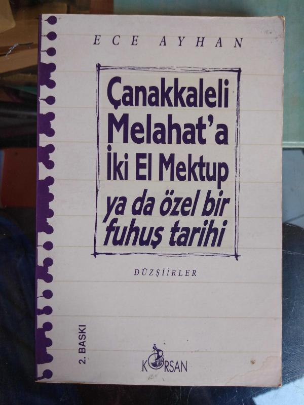 Çanakkaleli Melahat'a İki El Mektup Ya Da Özel Bir Fuhuş Tarihi - İKİNCİ EL, Ece Ayhan tarafından kaleme alınmıştır. Kitap 1994 yılında KORSAN tarafından [İstanbul] yayınlanmıştır. 85 sayfadır. Çanakkaleli Melahat'a İki El Mektup Ya Da Özel Bir Fuhuş Tarihi - İKİNCİ EL adlı eser Türkçe dilindedir.