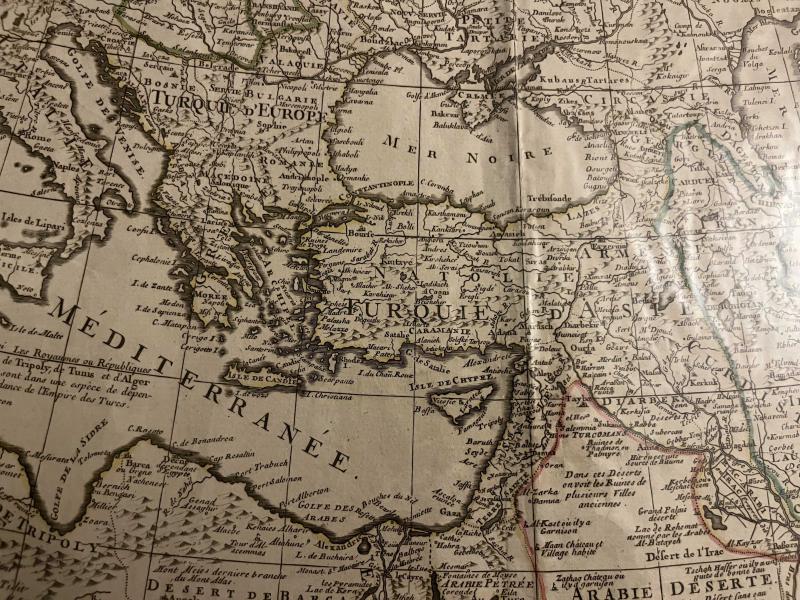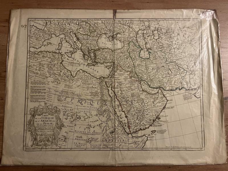 Büyük boy orjinal Türkiye, İran ve Arabistan haritası. 1776 yılına aittir. CARTE DE LA TURQUIE DE L’ARABIE ET DE LA PERSE où se voit tout l’Empire des Turcs Dressée sur les Mémoires les plus récens rectifiée par l’Observateur Par G. de l’Isle, Géographe ordinaire du Roy A Paris, Chez Dezauche, Successeur des Sieurs Delisle et Buache, Rue des Noyers Avec Privilege du Roi Augmentée par Ph. Buache en 1776 Guillaume De L’Isle’in (1675–1726) orijinal haritasının 1776 tarihli Philippe Buache baskısıdır. 18. yüzyıl orijinal gravür baskısı sayılan bir edisyondur. Bakır gravür baskıdır). • El renklendirme (idari sınırlar renkli). • Yaklaşık boyut: 55 × 78 cm (atlas sayfası boyutu). • “Chez Dezauche, Rue des Noyers” adresi: Bu dönem Paris gravürcülerinin orijinal adreslerinden biridir. Not: Fotoğraflarda da görüldüğü üzere kat yerinde ve sağ üst köşesinde hafif yırtık bulunuyor. Fiyatı belirlenirken bu durum dikkate alınmıştır.