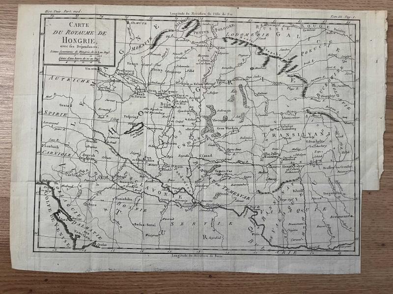 30x23 cm (Çerçeve) Bir kenarında çerçeveye kadar 4-5 cmlik kesik vardır. Carte du Royaume de Hongrie, avec ses Dépendances.” Macaristan Krallığı ve tâbi bölgelerini gösterdiğini belirtir. Başlık kutusunun alt kısmında ölçek çubukları vardır; bu, 18. yüzyıl Fransız kartografisi için çok tipiktir. Harita üzerinde: • Macaristan (Hongrie) • Transilvanya (Transilvanie) • Hırvatistan, Slavonya • Boğdan, Eflak • Dalmaçya, Bosna, Sırbistan • Avusturya, Moravya, Polonya gibi geniş Orta Avrupa–Balkan coğrafyası yer almaktadır. Guillaume Delisle – Phillipe Buache – Jean-Baptiste d’Anville ekolü (1750–1780) Bakır levha. Nadirdir.