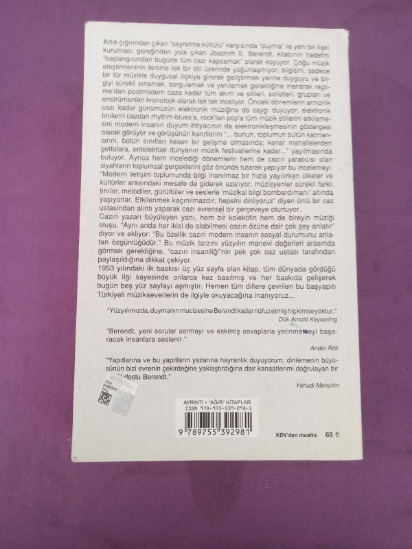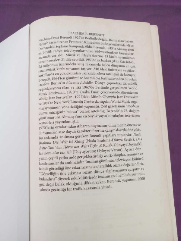 Artık çığırından çıkan seyretme kültürü karşısında duyma ile yeni bir ilişki kurulması gereğinden yola çıkan Joachim E. Berend, kitabının hedefini başlangıcından tersine tek bir stil üzerinde yoğunlaşmıyor; bilgisini, sadece bir tür müzikle duygusal ilişkiye girerek geliştirmek yerine duyguyu ve bilgiyi sürekli sınamak, sorgulamak ve yenilemek gerektiğine inanarak ragtime´den postmodern caza kadar tüm akım ve stilleri, solistleri, grupları armonik cazı kadar günümüzün elektronik müziğine de saygı duyuyor; elektronik tınıların cazdan rhythm-blueas´a, rock´tan pop´a tüm müzik stillerini etkilemesini modern insanın duyum ihtiyacının da elektronikleşmesinin göstergesi olarak görüyor; ve görüşünün kanıtlarının ...bunun, toplumun bütün katmanlarını, bütün sınfları kesen bir gelişme olmasında; kenar mahallelerden gettolara, entelektüel dünyanın müzik festivallerine kadar... yayılmasında buluyor.