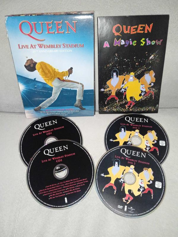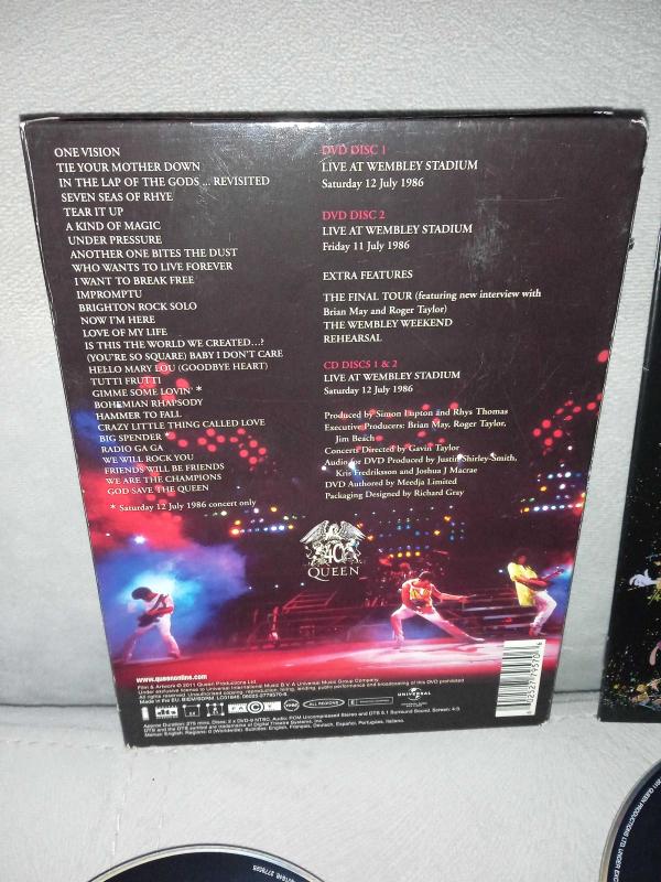 Cd & Dvd QUEEN - LIVE AT WEMBLEY STADIUM 25th ANNIVERSARY EDITION. Orijinal. Avrupa baskı. Toplam 4 disk. 2 cd ve 2 dvd den oluşuyor. Diskler 10 üzerinden 9.5 sorunsuz çalışıyor. Digipack in fotoğrafta görülen kısmında yırtık ile cd plastiginde kullanımı etkilemeyen kırık var.