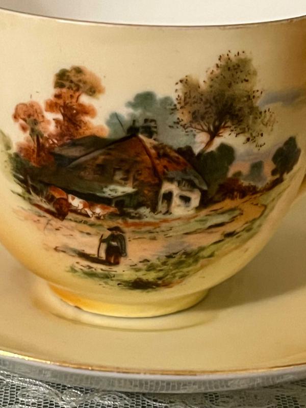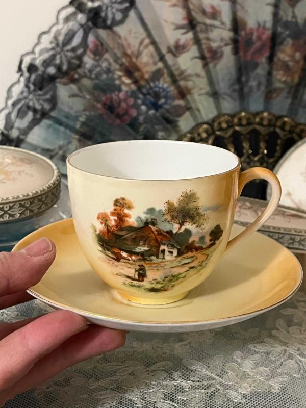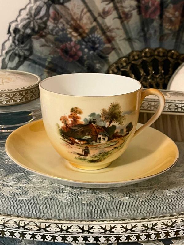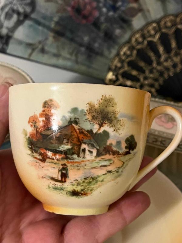1920–40’lar Çekoslovakya üretimi Victoria damgalı, el boyaması pastoral desenli nadir vitrin fincan takımı. İnce porseleni, zarif formu ile koleksiyonunuza değer katacak