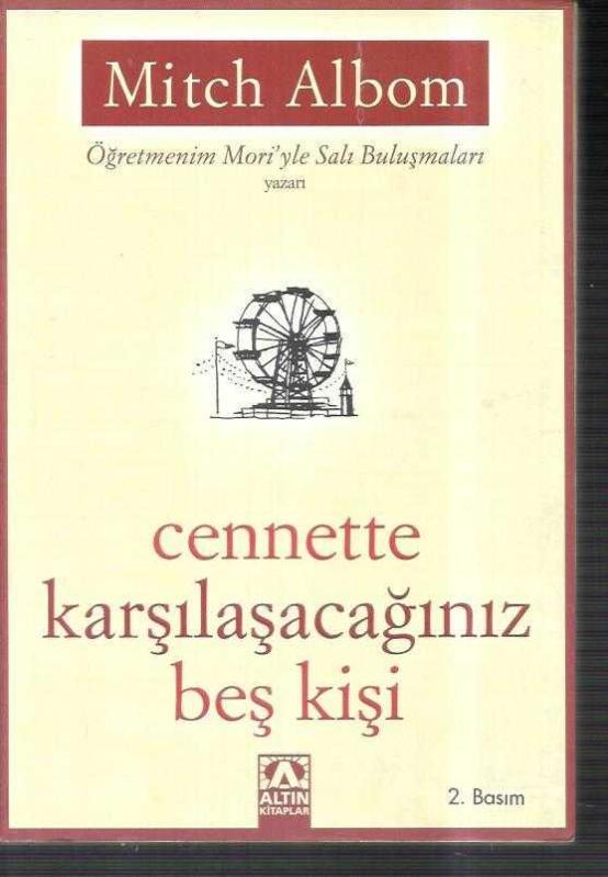 Cennette Karşılaşacağınız Beş Kişi, Mitch Albom tarafından kaleme alınmıştır. Kitap 2004 yılında Altın Kitaplar tarafından [İstanbul] yayınlanmıştır. Bu baskının çevirisi Zeliha İyidoğan Babayiğit tarafından yapılmıştır. 191 sayfadır. Sayfa bilgisi 3. hamur olarak belirtilmiştir. Cennette Karşılaşacağınız Beş Kişi adlı eser Türkçe dilindedir.
