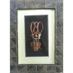 Güney Amerika orijinli, çerçeveli ve cam altı korumalı, ahşap oyma dekoratif maske. Çerçeveli ölçüsü 40x30 cm, maskenin yüksekliği 17 cm. Çerçevede biraz çizik yanı sıra sağ alt köşede ezilme mevcut.