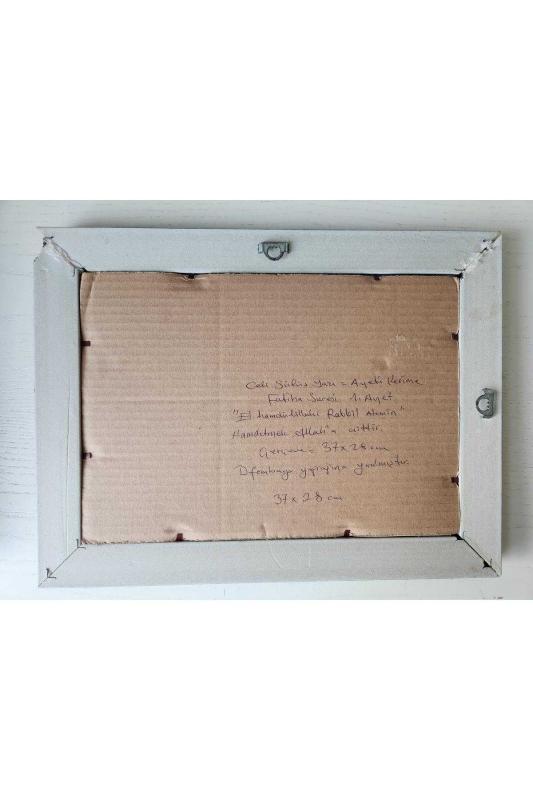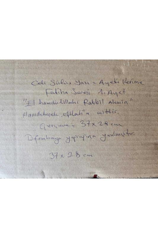 Çerçevesinde Hat Yazı Tablo. 37x28cm camlı çerçeveli tablosunda. El çekme yaprak üzerine yazı başlıklı antika/koleksiyon objesinin menşei belirtilmemiştir. Objenin ait olduğu dönem bilinmeketedir.