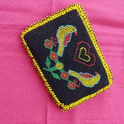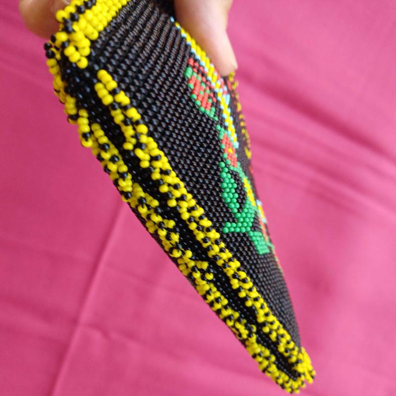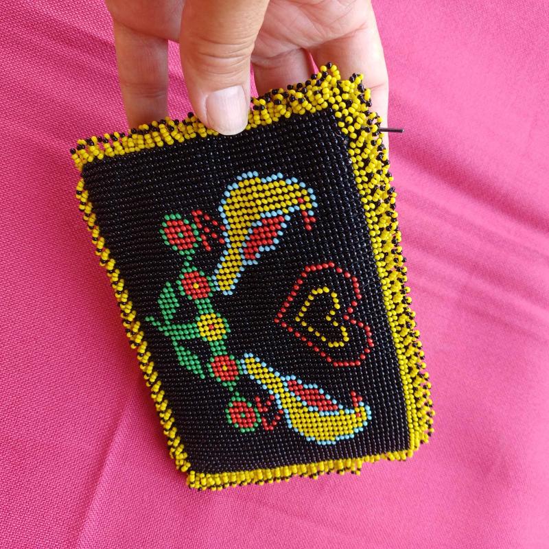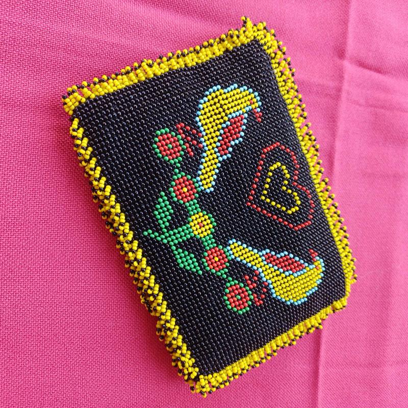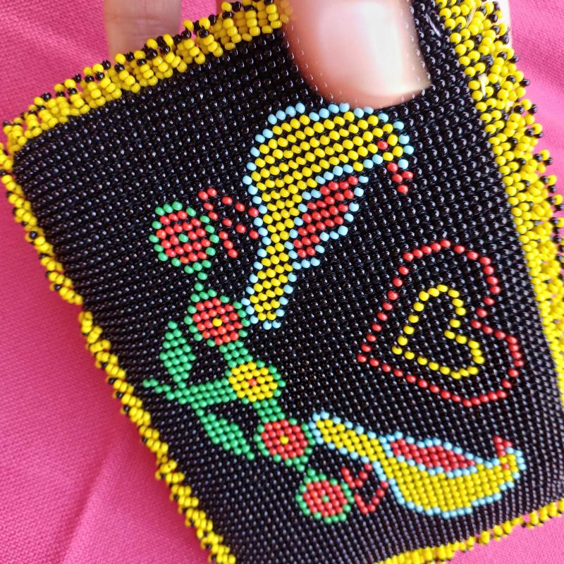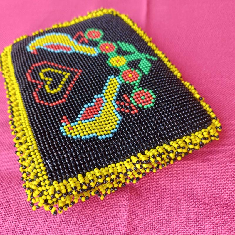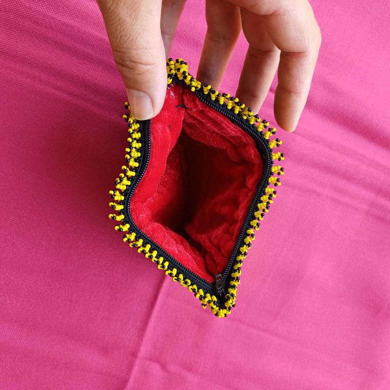 Hapishane veya cezaevi isi olarak da bilinen boncuk örme sanatı ile uretilmis fermuarlı çanta. 1990 li yollardan. Yepyeni.İçi kirmizi kadife. Çift taraflı motifli.Kusurduz.Hıç kullanılmadi. Kenarlari kısa boncuk püsküllü. 15 x 11 cm Tam bir el emegi goznuru. Minik kum boncuklarla örülmüş. Isterseniz kiymetli takilarinizi muhafaza edebileceginiz bir kese olarak da kullanabilirsiniz.