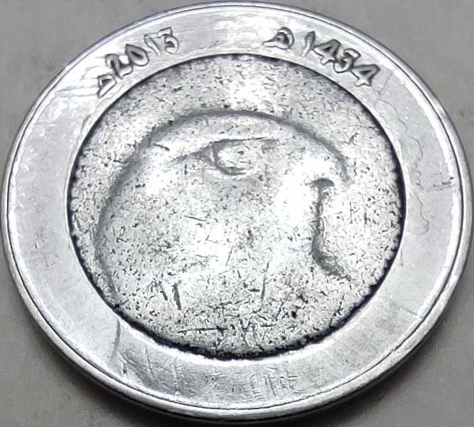 Cezayir’in modern nümismatik serisinin en karakteristik parçalarından biri olan bu 2013 (Hicri 1434) yılı 10 Dinarı, estetik tasarımı ve bi-metalik yapısıyla öne çıkar. Paslanmaz çelik iç göbeği çevreleyen alüminyum-bronz dış halkasıyla dayanıklı ve şık bir forma sahiptir. Paranın ön yüzünde, Cezayir'in doğasını ve gücünü simgeleyen, yüksek kabartma işçiliğiyle dikkat çeken bir Şahin (Falcon) büstü yer almaktadır. Arka yüzünde ise "10" nominal değeri, geleneksel İslam sanatının modern bir yorumu olan geometrik desenli bir fon üzerinde sunulmuştur. Cezayir Merkez Bankası (Bank el-Cezayir) ibaresi ve basım yılı hem Miladi hem de Hicri takvime göre paranın üzerinde yer almaktadır. Kondisyonu itibariyle şahin figürünün tüy detayları ve metalik kontrastı oldukça temiz durumdadır. Hem fauna (hayvan) temalı koleksiyonlar hem de bi-metalik dünya paraları setleri için ideal bir parçadır.