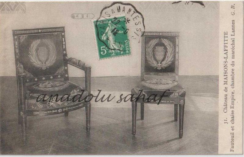 Chateau de Maisons Laffitte - Fauteuil et chaise Empire, chambre du marechal Lannes, 1912 / Fransız Postasından Geçmiş, Ön Yüzü Pullu, Ön ve Arka Yüzü Damgalı başlıklı ürün, Efemera, Müzik, Sinema > Kartpostallar > Yabancı Kartpostal > Şehir kategorisi altında İkinci El olarak satılmaktadır.
