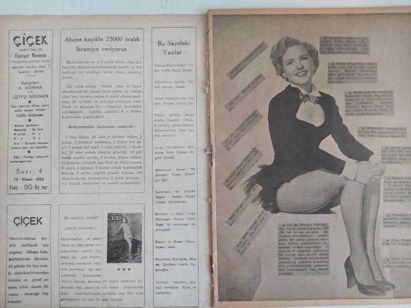 Çiçek Haftalık Aktüalite Sinema Tiyatro Müzik ve Magazin Dergisi - 10 Nisan 1952 - Sayı:4 - Linda Darnell - Joe F. Brown - Dalyan Boylu Kadın - Refik Halid Karay - Görüşler - Bana Kalırsa... - Erkeklerin iç yüzü - Osman Nihad - İdeal Vücut - Destine Emre - Arap İhtilalcileri arasında İngiliz Kemal - Kadınlık gururu - Hümaşah Hiçan - Orhan Özkey - Hayatımı kurtaran kobra - Mark Bryant - Hitler Tımarhanede - Necdet Rüştü Efe - Kimi sevdiğini söyle, sana seni anlatayım - Orhan Elmas - Haftanın en güzel filmleri - Saraylara ait müthiş ifşaat - Haluk Cemal Beydreşman - Müzeyyen Senar - Sadettin Işık - Lale Ali - Cahit Irgat - Orhan Elmas - Yakın şarkta beyaz kadın ticareti - Sahne ve perdemizin mesut çifti - Perihan ve Suavi Tedü - Kamara penceresinde ölüm - Baynard Kendrick - June Haver - Kadınlık Gururu - Bulmaca - Hitler tımarhanede - Aşk ve memleket romanı - Dağbaşı - Ali Kemal Meram - Dünyadaki garip hadiseler - Okuyucularla başbaşa - Aşk ve izdivaç - Muzaffer Tema -Tam Takım Dergi Yıpranma, sararmalar, kupon kesiği ve yırtılmalar zamana bağlı olarak görülebilir