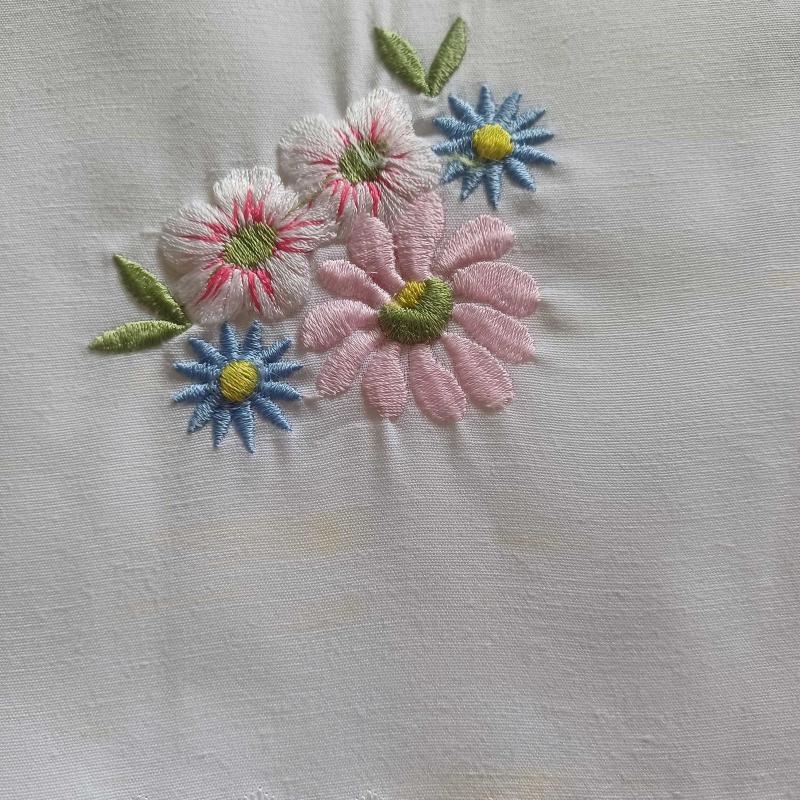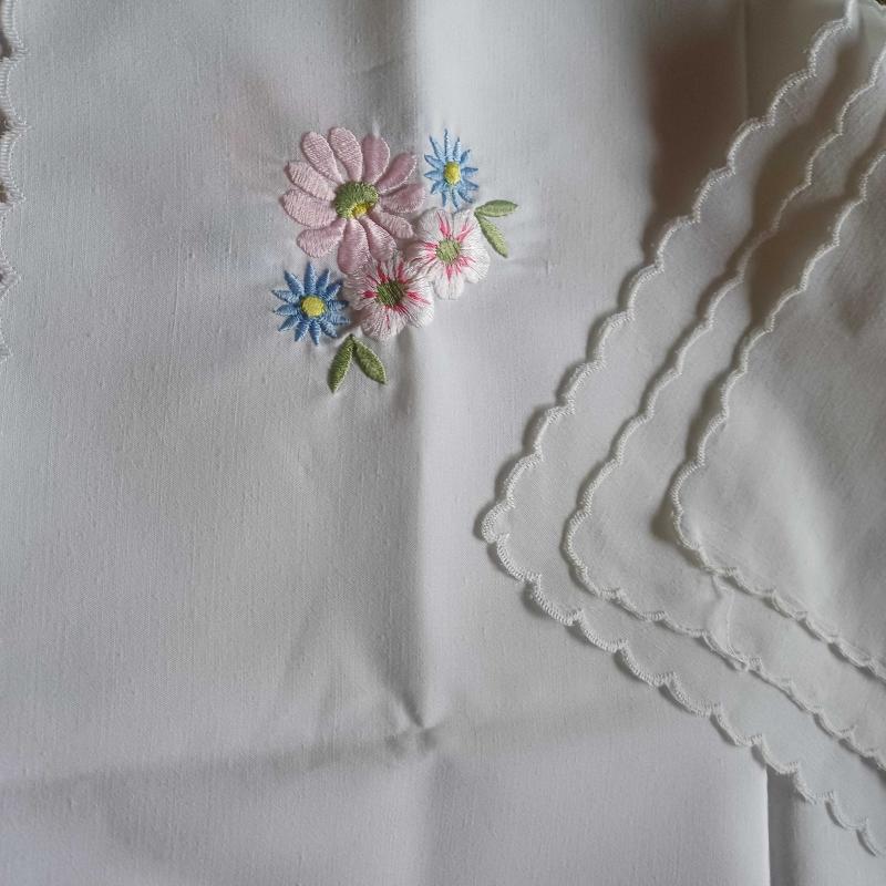 Hic kullanilmamis bir ceyiz ortusu seti . 3 adet ,birer köşesi pastel mavi pembe ve yesil renklerde cicek motifi işlenmiş kumaş örtüler. Nakislar makine nakisi. Ortu kenarlari pikolu. Kumaş kolali gibi tok bir kumaş ancak kalin degil.Keten gorunumunde bir dokusu var ancak sentetik. Yaz sofralariniza eslik edecek harika ve sıfir ortuler. 1 tanesinde ,belli bir kisimda hafif sararma mevcut(bkz foto).Diger ikisinde hicbir kusur yoktur. Olcu 48 x 48 cm