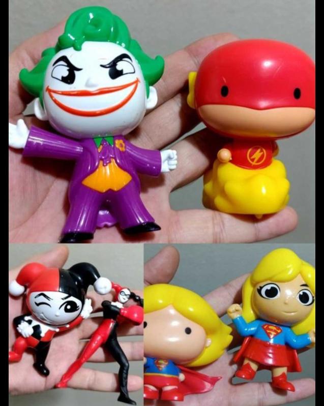 Çizgi film animasyon kahramanları karakter figür oyuncak set koleksiyon dekor tasarım hediye vintage retro aksesuar nostalji süs hobi minyatür diorama reklam promosyon joker Harley Quinn süper girl flash vb. başlıklı antika/koleksiyon objesinin menşei belirtilmemiştir. Objenin ait olduğu dönem bilinmeketedir.