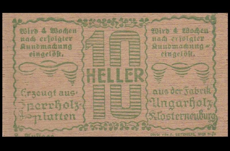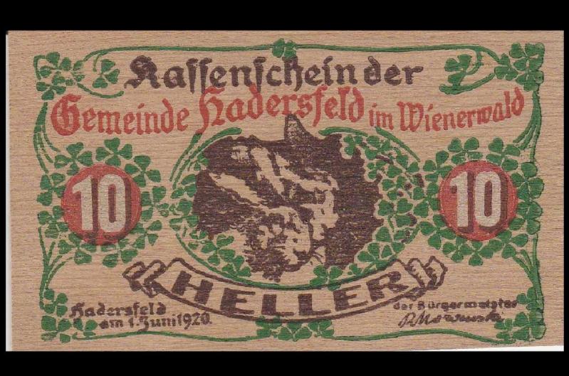 Hadersfeld Belediyesi (AsagI Avusturya Federal Eyaleti) Ahsap 10 Heller 1920 1. Dünya SavasI sonrasi dönemde Avusturya'da yasanan madeni para kitligi nedeniyle birçok belediye ve kurum, "Notgeld" adi verilen geçici ödeme araçlarl basti. Hadersfeld Belediyesi tarafindan 1920'de ihraç edilen 10 Heller kupürü, alisilmis kâgit yerine ahsap üzerine basilmis olmasiyla dikkat çeker. Bu tür ahsap notlar, hem günlük kullanim için kisa süreli tedavül görmüs hem de koleksiyonlarda özgün malzemesi ve sinirli basimi nedeniyle özel bir yere sahip olmustur. Bugün numizmatik açidan, savas sonrasi ekonomik sikintilarin ve yerel otoritelerin yaratici çözümlerinin somut bir belgesi olarak degerli kabul edilmektedir.
