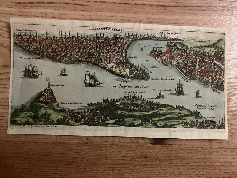 Eserin Adı: Constantinopel (Constantinople) Konusu: Haliç ve Boğaziçi girişinden İstanbul’un panoramik görünümü Dil: Flamanca (Felemenkçe) Teknik: El renklendirmeli bakır gravür (dönem renklendirmesi) Tahmini Dönem: 17. yüzyılın ikinci yarısı Tarz: Veduta (şehir panoraması) Orjinal ve nadirdir. Jacob Peeters. Antwerpen, 1686 baskıdır, kendi döneminde renklendirilmiştir.