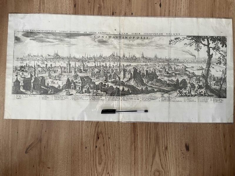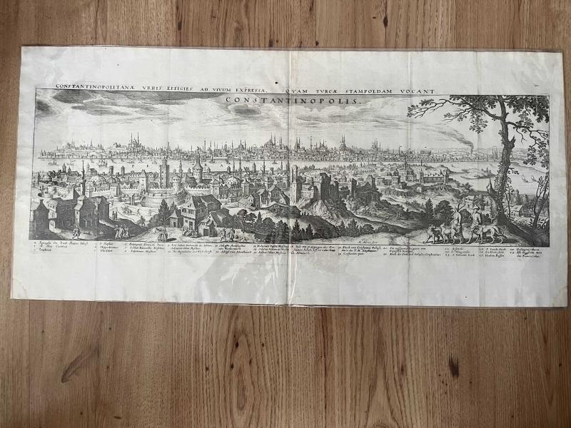 Constantinople 75x36 cm %100 Orjinal!! “CONSTANTINOPOLITANA VRBIS EFFIGIES AD VIVUM EXPRESSA, QUAM TURCAE STAMBOLDAM VOCANT.” Türkçesi: “Konutların (şehir) canlı bir görünümü olan Konstantinopolis tasviri; Türkler buna Stambol der.” Bu ifade, İstanbul’un 17. yüzyıl veya daha erken dönem panoramik gravürlerinin klasik girişidir. Matthäus Merian – Topographia eserinden!!! Nadir bir parça Matthäus Merian (1593–1650), dönemin en önemli kartograflarından biridir ve bu eseri, 1630-1650’lere aittir. İyi korunmuştur. Ekspertize açıktır. Uluslararası güncel piyasa değerini internetten araştırabilirsiniz (1000-1500€ civarındadır).