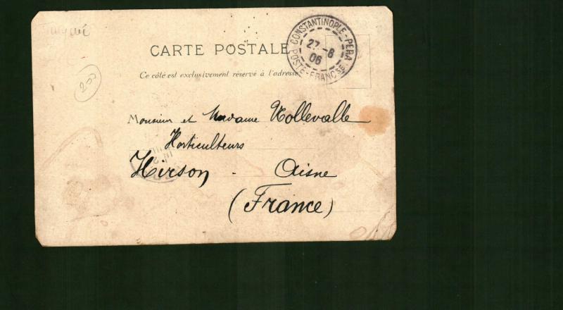 Postadan geçmiş (Poste-Françse), pullu 27/6/1906 tarihi damgalı, renklendirilmiş kartpostal. Ön kısımda hafif lekeler var.