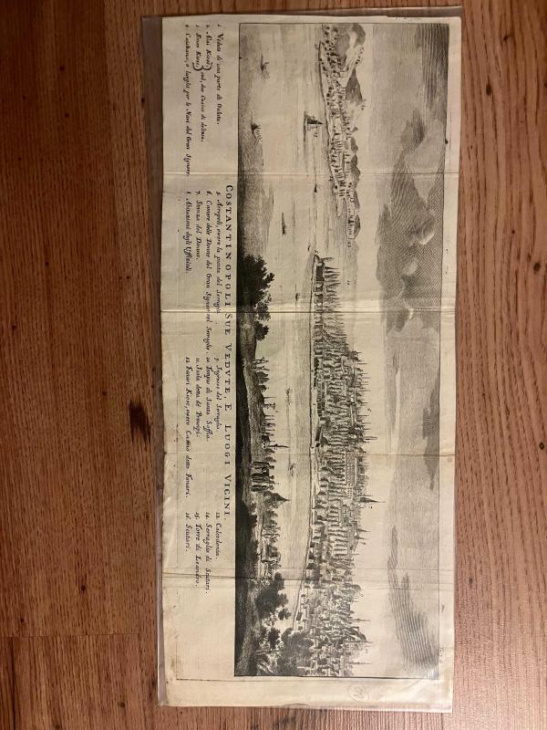 Eserin Adı: Costantinopoli sue vedute e luoghi vicini Türü: Bakır gravür Konu: İstanbul’un panoramik manzarası — Haliç, Boğaziçi ve Tarihi Yarımada genel görünümü Yazı Dili: İtalyanca Tahmini Dönem: 18. yüzyıl Tarz: Veduta (şehir manzarası gravürü) Eser orjinaldir ve nadirdir.