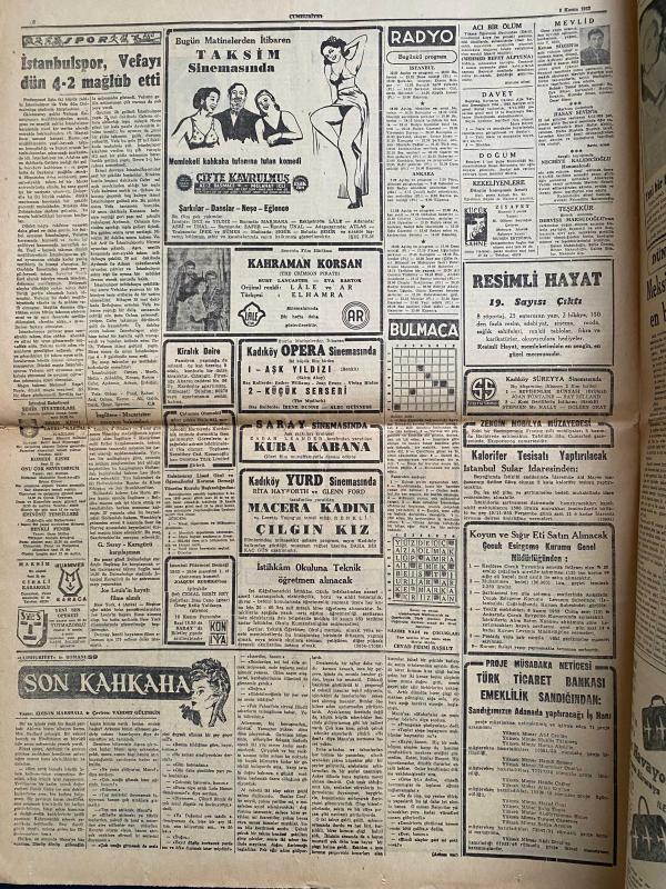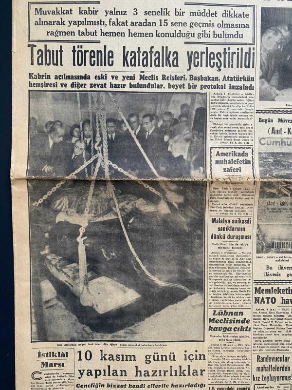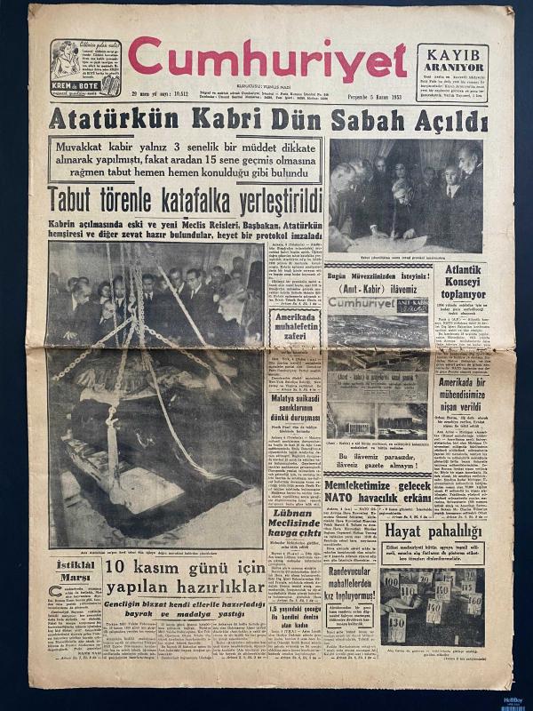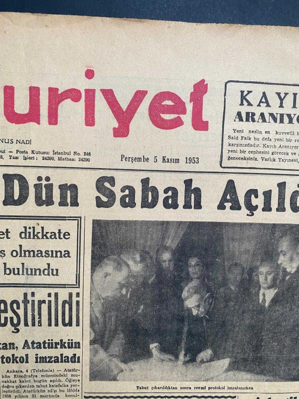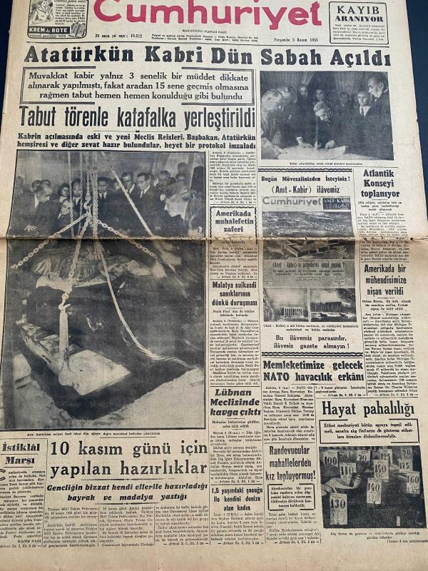 TARİHİ GAZETE - Harika bir koleksiyon parçası! Bu gazete, Türk tarihinin en önemli dönüm noktalarından birine tanıklık ediyor. 10 Kasım 1953'teki büyük nakil öncesi, Atatürk'ün naaşının Etnografya Müzesi'ndeki geçici kabrinden çıkarılmasını konu alan 5 Kasım 1953 tarihli Cumhuriyet Gazetesi. . TARİHE TANIKLIK EDİN: 5 KASIM 1953 🇹🇷 Cumhuriyet tarihimizin en hüzünlü ve en vakur anlarından birine, o günün baskısıyla tanık olun. Atatürk’ün naaşının Anıtkabir’e nakledilmeden hemen önceki ilk adımı: Geçici kabrin açılışı. 📍 Öne Çıkan Başlıklar: * "Atatürk'ün Kabri Dün Sabah Açıldı" * "Tabut törenle katafalka yerleştirildi" * Etnografya Müzesi'ndeki o tarihi anın nadir fotoğrafları. * Dönemin sosyal yaşamına dair nostaljik ilanlar (Taksim Sineması, Kahraman Korsan filmi, eski radyo programları). 📜 Kondisyon: Zamana bağlı doğal sararmalar mevcut, metinler okunaklı ve formunda. Tam bir koleksiyon parçası.