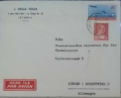 Cumhuriyet 1955 J.DELLA.TOLLA ZARF Ata 15kr & Hava postası pullarla İstanbul'dan ELMA SINGEN Almanya'ya gitmiş ,,Nadir. ,Nadir.