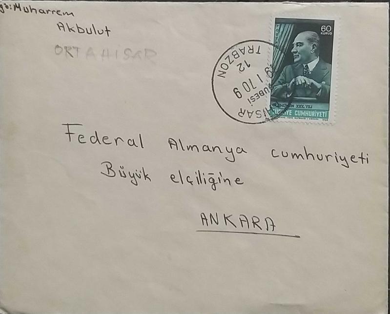 Cumhuriyet 1970 ZARF Ortahisar Trabzon'dan Ata 60 kuruş pulu ile Ankara'ya gönderilmiş ,Nadir.ş ,Nadir.