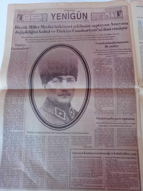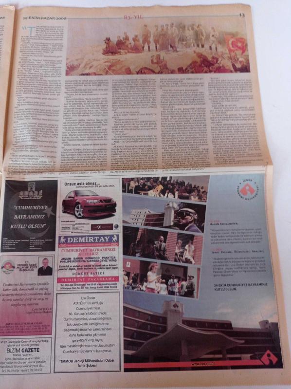Cumhuriyet 83. Yıl Gazetesi - 29 Ekim 2006 - 28 Ekim Cumhuriyet Bayramı - Gazi Mustafa Kemal Atatürk Çizimi - Cumhuriyet Tehlikede Mi - Nazım Hikmet - Atatürk'ün Devrim Modeli - Ata'nın Kaleminden Cumhuriyet adlı eser, Kitap > Süreli Yayınlar > Gazeteler kategorisinde İkinci El olarak satıştadır.