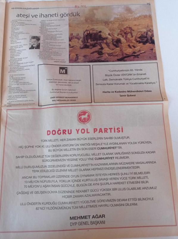Cumhuriyet 83. Yıl Gazetesi - 29 Ekim 2006 - 28 Ekim Cumhuriyet Bayramı - Gazi Mustafa Kemal Atatürk Çizimi - Cumhuriyet Tehlikede Mi - Nazım Hikmet - Atatürk'ün Devrim Modeli - Ata'nın Kaleminden Cumhuriyet adlı eser Türkçe dilindedir.