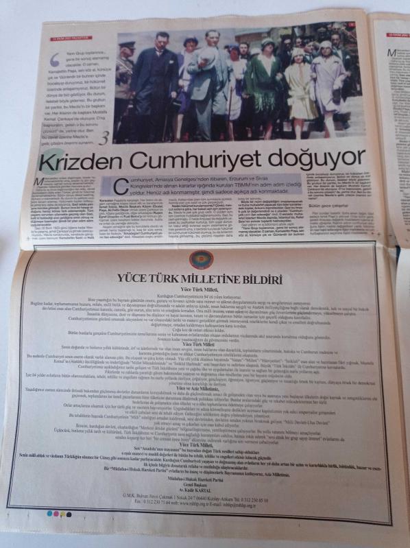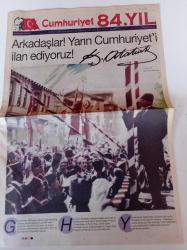 Sayfa Boyutu: 38*56cm Sayfa Sayısı: 10 Cumhuriyet 84. Yıl Gazetesi Yıpranma, sararmalar, kupon kesiği ve yırtılmalar zamana bağlı olarak görülebilir