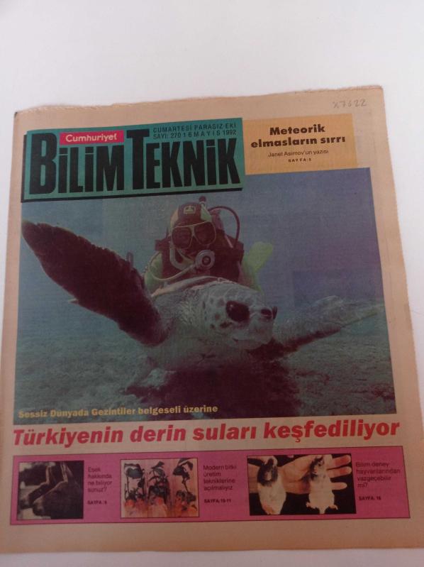 Cumhuriyet Bilim Teknik Gazetesi - 16 Mayıs 1992- Sayı 270 - Galata Köprüsündeki Balıklar Neden Gaz Kokuyor -Sessiz Dünyada Gezintiler Belgeseli Üzerine - Türkiye'nin Derin Suları Keşfediliyor- Eşek Hakkında Ne Biliyorsunuz- Modern Bitki Üretim Tekniklerine Açılmalıyız- Bilim Deney Hayvanlarından Vazgeçebilir Mi adlı eser Türkçe dilindedir.