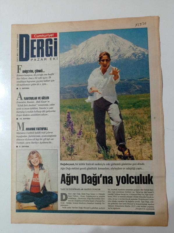 Cumhuriyet Dergi Gazetesi - 14 Temmuz 2002 - Sayı 851 - Ağrı Dağına Yolculuk - İshak Paşa Sarayı - - Yavuz Sultan Selim - Şah İsmail - Doğubeyazıt - Fahişeyim Çünkü - Anahtarlar Ve Gizler - Tatavla - Marianne Faithfull adlı eser Türkçe dilindedir.
