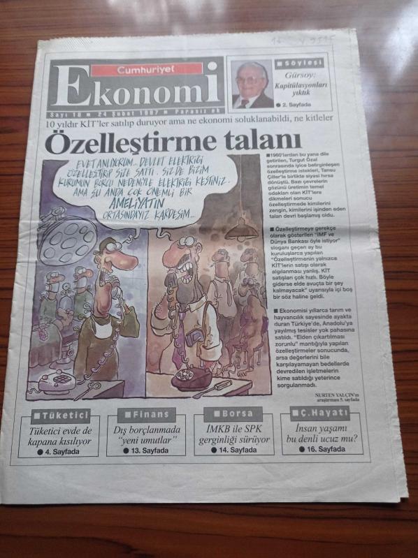 Cumhuriyet Ekonomi Gazetesi - 24 Şubat 1997 - Sayı 18 - Mithat Giyim Kapitülasyonları Yıktık - Özelleştirme Talanı - Tüketici Evde De Kapana Kısılıyor - Dış Borçlanmada Yeni Umutlar - İMKB Ve SPK Gerginliği Sürüyor - Kamu Malları Talanında 10. Yıl - İşsizlik Ve Sendikasızlaştırma adlı eser, Kitap > Süreli Yayınlar > Gazeteler kategorisinde İkinci El olarak satıştadır.