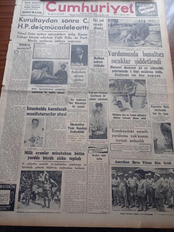 Cumhuriyet Gazetesi - 1 Ağustos 1954 - Kurultaydan Sonra CHP İçinde İç Mücadele Arttı - Devlet Vekili Doktor Mükerrem Sarol - Radyoların Çalışma Saatleri - Müslüman Olan Bir Ermeni Delikanlısı Gülhane Parkında Sünnet Edildi - İstanbul'da Kurulacak Manifaturacılar Sitesi - Milli Oyunlar Müsabakası Bütün Yurtta Büyük Alaka Topladı - Amerikan Hava Filosu Dün Geldi - Balkan Askeri İttifakı - Hasan Ali Yücel Köşe Yazısı - Kıbrıs'ta Türklerin Bugünkü Mitingi - Muhtar Seçimleri 7 Kasım'da Yapılacak - Abdülazizin Ölümü - Transfer Ayı Dün Nihayete Erdi - Safiye Ayla - Belkis Öziner - Film Yıldızı Ayfer Feray Puro Tuvalet Sabunları Kullanıyorum Diyor - Hamiyet Yüceses - Perihan Sözer - Münir Nurettin Selçuk- Lütfü Güneri Gecesi, Yunus Nadi tarafından kaleme alınmıştır. Cumhuriyet Gazetesi - 1 Ağustos 1954 - Kurultaydan Sonra CHP İçinde İç Mücadele Arttı - Devlet Vekili Doktor Mükerrem Sarol - Radyoların Çalışma Saatleri - Müslüman Olan Bir Ermeni Delikanlısı Gülhane Parkında Sünnet Edildi - İstanbul'da Kurulacak Manifaturacılar Sitesi - Milli Oyunlar Müsabakası Bütün Yurtta Büyük Alaka Topladı - Amerikan Hava Filosu Dün Geldi - Balkan Askeri İttifakı - Hasan Ali Yücel Köşe Yazısı - Kıbrıs'ta Türklerin Bugünkü Mitingi - Muhtar Seçimleri 7 Kasım'da Yapılacak - Abdülazizin Ölümü - Transfer Ayı Dün Nihayete Erdi - Safiye Ayla - Belkis Öziner - Film Yıldızı Ayfer Feray Puro Tuvalet Sabunları Kullanıyorum Diyor - Hamiyet Yüceses - Perihan Sözer - Münir Nurettin Selçuk- Lütfü Güneri Gecesi adlı eser Türkçe dilindedir.