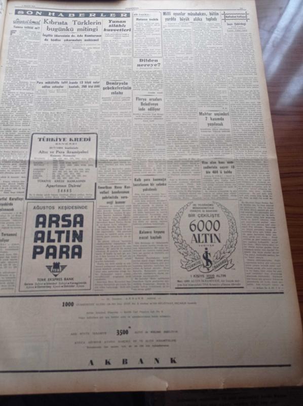 Cumhuriyet Gazetesi - 1 Ağustos 1954 - Kurultaydan Sonra CHP İçinde İç Mücadele Arttı - Devlet Vekili Doktor Mükerrem Sarol - Radyoların Çalışma Saatleri - Müslüman Olan Bir Ermeni Delikanlısı Gülhane Parkında Sünnet Edildi - İstanbul'da Kurulacak Manifaturacılar Sitesi - Milli Oyunlar Müsabakası Bütün Yurtta Büyük Alaka Topladı - Amerikan Hava Filosu Dün Geldi - Balkan Askeri İttifakı - Hasan Ali Yücel Köşe Yazısı - Kıbrıs'ta Türklerin Bugünkü Mitingi - Muhtar Seçimleri 7 Kasım'da Yapılacak - Abdülazizin Ölümü - Transfer Ayı Dün Nihayete Erdi - Safiye Ayla - Belkis Öziner - Film Yıldızı Ayfer Feray Puro Tuvalet Sabunları Kullanıyorum Diyor - Hamiyet Yüceses - Perihan Sözer - Münir Nurettin Selçuk- Lütfü Güneri Gecesi adlı eser, Kitap > Süreli Yayınlar > Gazeteler > Türkiye > Genel > Günlük kategorisinde İkinci El olarak satıştadır.