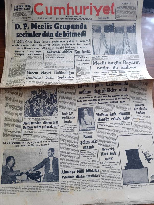 Cumhuriyet Gazetesi - 1 Kasım 1955 - Bravo Grupa yazan Nadir Nadi Başmakale - Demokrat Parti meclis grubunda seçimler dün de bitmedi - atom harbine hazırlık fotoğraf - Ekrem Hayri Üstündağ'ın İzmir'deki basın toplantısı - prenses Margaret albay Towsend ile evlenmeyeceğini Dün ilan etti - halkın aşık olduğu dansöz küçük Mualla erkek çıktı - meteoroloji Yüksek okulu açılıyor - Tek Atlı arabasını sattı piyango bileti aldı ve bayram günü tam 100,000 lira kazanan Abdülaziz Alptekin fotoğraf - 1 Bedende 2 Adam Yazan Va Nü yazı dizisi - Garanti Bankası - Londra sefirimiz Suat Hayri Ürgüplü İngiliz Devlet bakanı ile görüştü - Japonya'da inşa edilen Bolu şilepimiz denize indirildi - Türk parası ve Türkiye'deki Amerikalılar - ekonomi ve Ticaret okulu Dün açıldı - Beylik hevesi yazan Burhan Felek - Rita Hayworth Ali Han ile evlenmeyecek - küçük sahnede Çayhane oyunu - Sumatra İlahesi Sümer ve Ferah sinemasında - 1.94 boyundaki kadın basketbolcu Sonja Mrak fotoğraf - Fenerbahçe New Jersey maçı adlı eser, Kitap > Süreli Yayınlar > Gazeteler > Türkiye > Genel > Günlük kategorisinde İkinci El olarak satıştadır.
