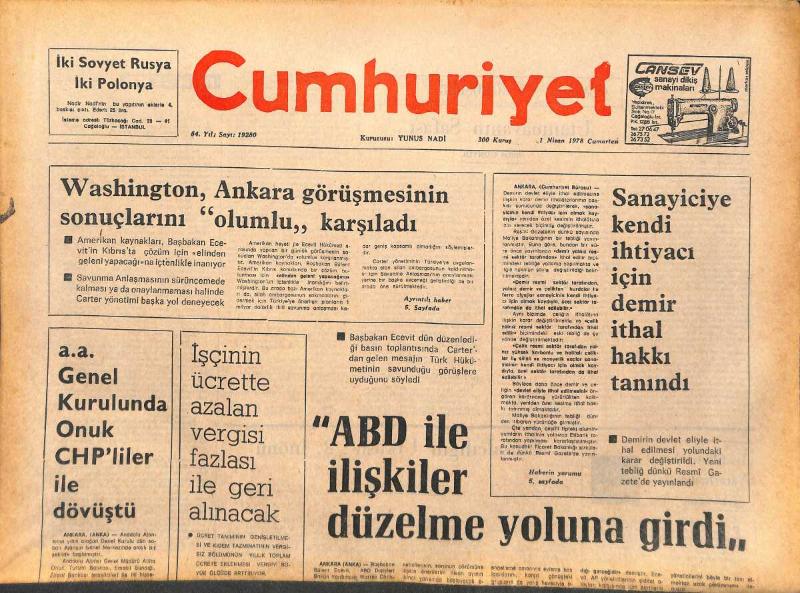 Cumhuriyet Gazetesi 1 Nisan 1978 - ABD İle İlişkiler Düzelme Yoluna Girdi - Washington, Ankara Görüşmesinin Sonuçlarını Olumlu Karşıladı! GZ143226, en son 20 gün önce güncellenmiştir.