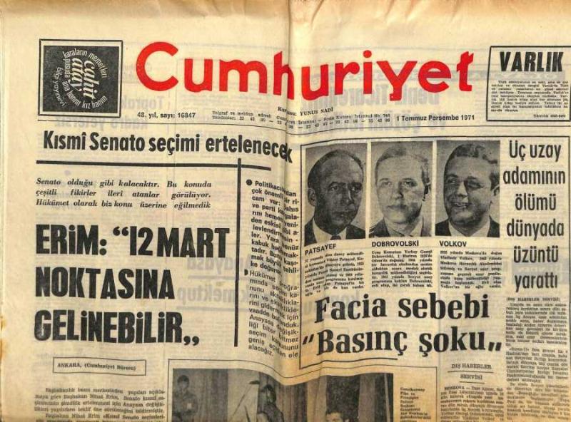 Cumhuriyet Gazetesi 1 Temmuz 1971 - 3 Uzay Adamının Ölümü Dünyada Üzüntü Yarattı GZ59127, en son 20 gün önce güncellenmiştir.