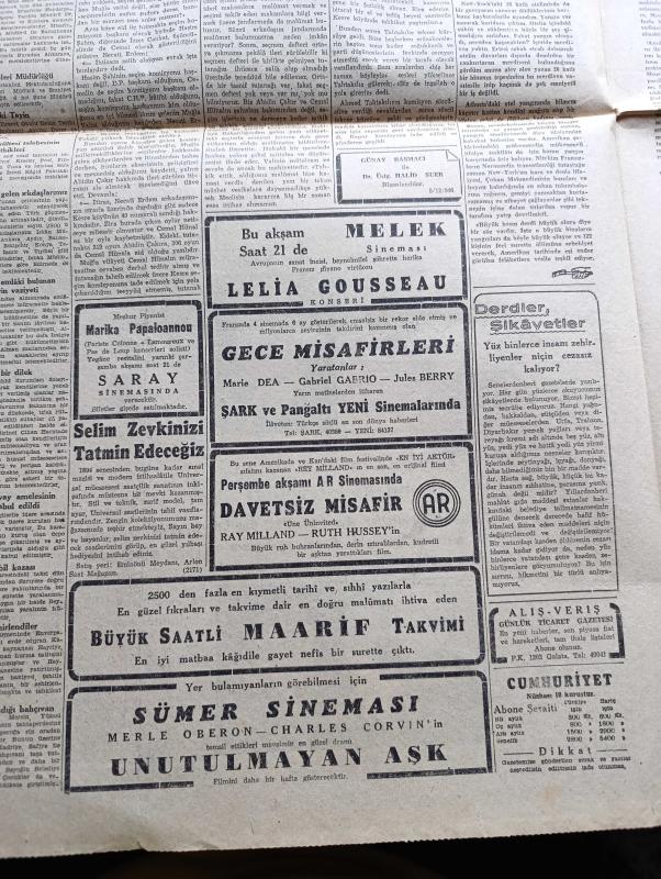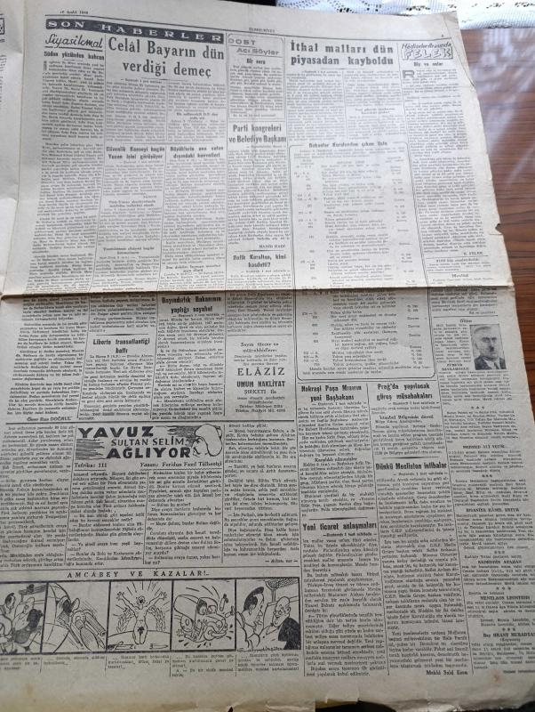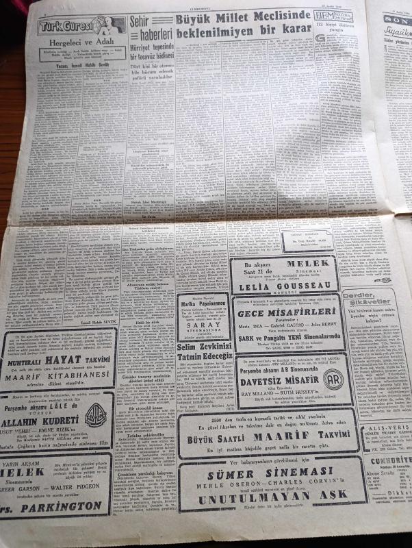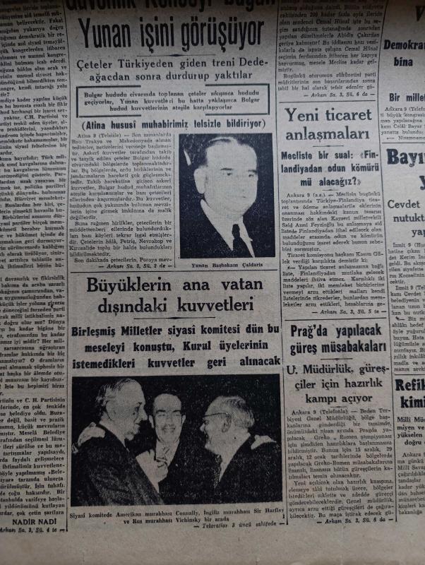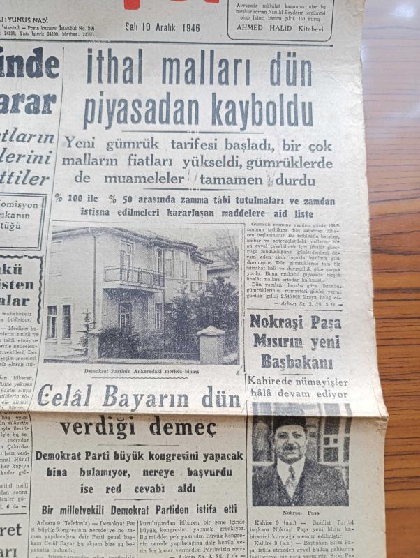 Cumhuriyet Gazetesi - 10 Aralık 1946 - Parti Kongreleri Ve Belediye Başkanı Yazanlar Nadir Nadi Köşe Yazısı - Büyük Millet Meclisinde Beklenilmeyen Bir Karar - CHP Milletvekilleri Demokratların Bir Seçim İşi Hakkındaki Tekliflerini İlk Defa Olarak İttifaklar Kabul Ettiler - İthal Malları Dün Piyasadan Kayboldu - Celal Bayar'ın Dün Verdiği Demeç - Nokraşi Paşa Mısırın Yeni Başbakanı - Amerikan Muharrası Connaly İngiliz Murahhası Sir Harfley Ve Rus Muharrası Vichinsky Birarada Fotoğraf - Refik Koraltan Kimi Kastetti - Türk Güreşi Yazan İsmail Habib Sevük - Lelia Gousseau Konseri Melek Sinemasında - Allah'ın Kudreti Filmi Perşembe Akşamı Lale Sinemasında - Yavuz Sultan Selim Ağlıyor Yazan Feridun Fazıl Tülbentçi Yazı Dizisi - Amcabey Ve Kazalar Çizen Cemal Nadir - Gripin - Şen Şapka - Bugünkü Radyo Programı - Rolex Saat Deposu - Limanımıza Gelen Ve Giden Vapurlar - Tural Öksürük ve Bronşite Karşı - Çocuk Hastalıkları Mütehassısı Doktor Niyazi Ali - İstanbul Belediyesi Şehir Tiyatroları, Yunus Nadi tarafından kaleme alınmıştır. Cumhuriyet Gazetesi - 10 Aralık 1946 - Parti Kongreleri Ve Belediye Başkanı Yazanlar Nadir Nadi Köşe Yazısı - Büyük Millet Meclisinde Beklenilmeyen Bir Karar - CHP Milletvekilleri Demokratların Bir Seçim İşi Hakkındaki Tekliflerini İlk Defa Olarak İttifaklar Kabul Ettiler - İthal Malları Dün Piyasadan Kayboldu - Celal Bayar'ın Dün Verdiği Demeç - Nokraşi Paşa Mısırın Yeni Başbakanı - Amerikan Muharrası Connaly İngiliz Murahhası Sir Harfley Ve Rus Muharrası Vichinsky Birarada Fotoğraf - Refik Koraltan Kimi Kastetti - Türk Güreşi Yazan İsmail Habib Sevük - Lelia Gousseau Konseri Melek Sinemasında - Allah'ın Kudreti Filmi Perşembe Akşamı Lale Sinemasında - Yavuz Sultan Selim Ağlıyor Yazan Feridun Fazıl Tülbentçi Yazı Dizisi - Amcabey Ve Kazalar Çizen Cemal Nadir - Gripin - Şen Şapka - Bugünkü Radyo Programı - Rolex Saat Deposu - Limanımıza Gelen Ve Giden Vapurlar - Tural Öksürük ve Bronşite Karşı - Çocuk Hastalıkları Mütehassısı Doktor Niyazi Ali - İstanbul Belediyesi Şehir Tiyatroları adlı eser Türkçe dilindedir.