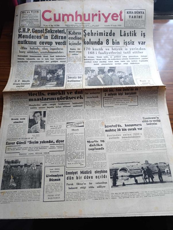 Cumhuriyet Gazetesi - 10 Aralık 1959 - CHP Genel Sekreteri Adnan Menderes'in Edirne Nutkuna Cevap Verdi - Kıbrıs Endişe İçinde Rumlar 200 Dinamit Çubuğu Çaldılar - İstanbul'da Lastik İş Kolunda 8 Bin İşsiz Var - Meclis Emekli Ve Dul Maaşlarını Görüşecek - Eski Bakanlar Diyorlar Ki 5 Röportajı Yapan Feyyaz Tokar - Emniyet Müdürü Feyyaz Tokar Aleyhine Bir Dava Açıldı - Aşk Eceli Yendi Çeviren Hamdi Varoğlu Yazı Dizisi - Unkapanında 300 Bina Daha Yıkılıyor - Alametler Yazan Burhan Felek Köşe Yazısı - Viyanalı Meşhur Kuartet'in Yarın Vereceği Konser - Dünyayı Fethetmek İçin Rusya Fezaya Güveniyor - Halide Edip Adıvar'ın Açık Gösterimi - Alman Ordusu Son Savaşta 4,000,000 Genç Kaybetti - Koruyucu Melekler Şatonun Kraliçesi Çizgi Roman - Bay Oscar Karikatür - Lale Tiyatrosunda Akif Bey Oyunu - Feriköy Vefa'yı Da Dün Mağlup Etti Fotoğraf - Zizinho Güney Amerika'da Futbol Kralı - Fenerbahçe'de Seracettin Boykot Gürcan İle Özcan İhtar Aldılar - Galatasaray Reisi Sadık Giz İstifa Etti, Yunus Nadi tarafından kaleme alınmıştır. Cumhuriyet Gazetesi - 10 Aralık 1959 - CHP Genel Sekreteri Adnan Menderes'in Edirne Nutkuna Cevap Verdi - Kıbrıs Endişe İçinde Rumlar 200 Dinamit Çubuğu Çaldılar - İstanbul'da Lastik İş Kolunda 8 Bin İşsiz Var - Meclis Emekli Ve Dul Maaşlarını Görüşecek - Eski Bakanlar Diyorlar Ki 5 Röportajı Yapan Feyyaz Tokar - Emniyet Müdürü Feyyaz Tokar Aleyhine Bir Dava Açıldı - Aşk Eceli Yendi Çeviren Hamdi Varoğlu Yazı Dizisi - Unkapanında 300 Bina Daha Yıkılıyor - Alametler Yazan Burhan Felek Köşe Yazısı - Viyanalı Meşhur Kuartet'in Yarın Vereceği Konser - Dünyayı Fethetmek İçin Rusya Fezaya Güveniyor - Halide Edip Adıvar'ın Açık Gösterimi - Alman Ordusu Son Savaşta 4,000,000 Genç Kaybetti - Koruyucu Melekler Şatonun Kraliçesi Çizgi Roman - Bay Oscar Karikatür - Lale Tiyatrosunda Akif Bey Oyunu - Feriköy Vefa'yı Da Dün Mağlup Etti Fotoğraf - Zizinho Güney Amerika'da Futbol Kralı - Fenerbahçe'de Seracettin Boykot Gürcan İle Özcan İhtar Aldılar - Galatasaray Reisi Sadık Giz İstifa Etti adlı eser Türkçe dilindedir.