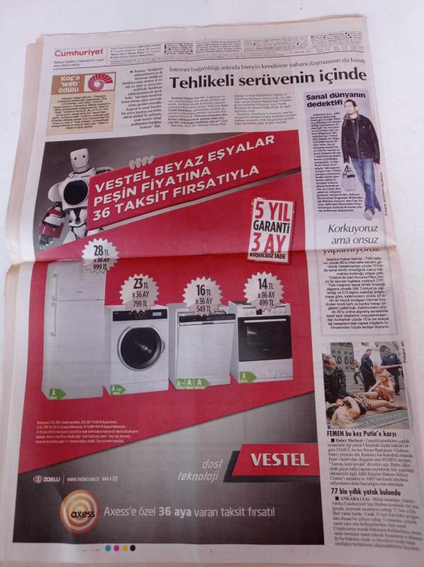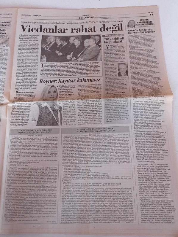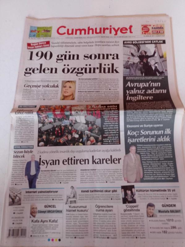 Cumhuriyet Gazetesi - 10 Aralık 2011 - Şike İddianamesi - Aziz Yıldırım - Sanal Dünyanın Dedektifi - FEMEN Bu Kez Putin'e Karşı - Rahmi Koç'tan Ekonomi ve Suriye Uyarısı - TÜSİAD Başkanı Ümit Boyner - Avrupa'nın Yalnız Adamı İngiltere - Hasan Ali Yücel adlı eser Türkçe dilindedir.