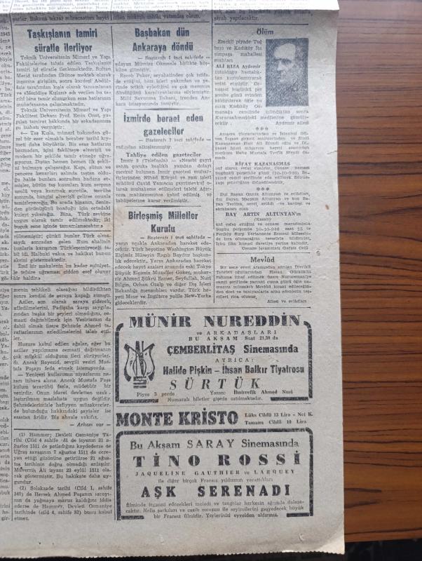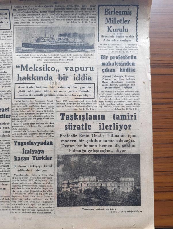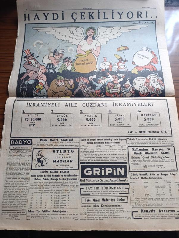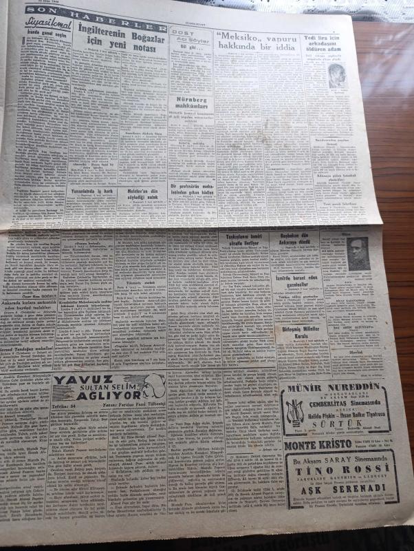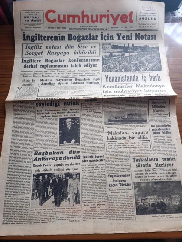 Cumhuriyet Gazetesi - 10 Ekim 1946 - iktidar bir emanettir yazan Nadir Nadi Başmakale - İngiltere'nin boğazlar için yeni notası - İngiliz notası dün size ve Sovyet Rusya'ya bildirildi - Kral Yorgi Atina'ya döndükten sonra eski Naib Damaskinos'un elini sıkıyor fotoğraf - Yunanistan'da iç harp - komünistlerin Makedonya için muhtariyet istiyorlar - Molotov'un dün söylediği nutuk - Roma'da Kanlı nümayişler - taşkışla'nın tamiri süratle ilerliyor fotoğraf - Başbakan Recep Peker Dün Ankara'ya döndü fotoğraf - yarı şaka yarı ciddi yazan Burhan Felek - genç kızlarımız neler okuyorlar Adile Ayda - İzmir'den ilk devlet yağı partisi dün geldiler - Yavuz Sultan Selim Ağlıyor yazan Feridun Fazıl Tülbentçi yazı dizisi - gerçek gazetesi davası - Türk meşhurları ansiklopedisi - Yedi lira için arkadaşını öldüren adam Yakup Korkmaz - Münir Nurettin Selçuk ve Halide Balkır tiyatrosu Çemberlitaş sinemasında - haydi çekiliyor renkli karikatür çizen Cemal Nadir - bugünkü radyo programı - Gripin adlı eser, Kitap > Süreli Yayınlar > Gazeteler > Türkiye > Genel > Günlük kategorisinde İkinci El olarak satıştadır.
