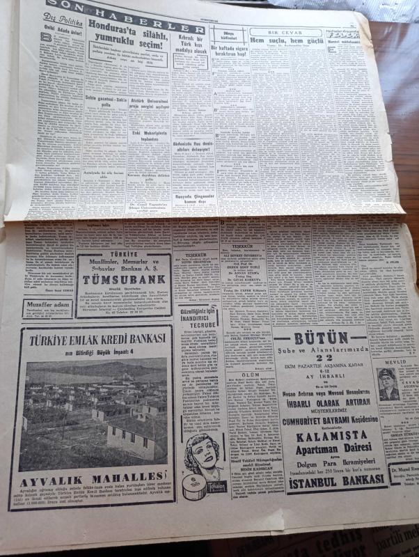 Cumhuriyet Gazetesi - 10 Ekim 1956 - Hürriyet Partisinin Lideri Fevzi Lütfi Karaosmanoğlu CHP'yi İtham Etti - Ticaret Bakanı Zeyyat Mandalinci Dün Gece Amerika'dan Geldi - Dinamo Takımı Fenerbahçe'nin Dolmabahçe Stadında Maçı Fotoğraf - Yunanlılar Sahillerimizdeki Bir Adayı Tahkim Etmeye Kalkıştılar - Kraliçe Süreyya Boşanmıyor - Memlekete Traktör Kaydıyla Giren Lüks Otomobil Fotoğraf- Ulubatlı Hasan Tatbikatı - Don Camillo'nun Küçük Alemi Yazan G. Guareschi Yazı Dizisi - Aşktan Da Üstün Yazan Elizabeth Gaskell Yazı Dizisi - Tramvaylar Tamamen Kaldırılmayacak - Oniki Adada Üsler Yazan Ömer Sami Coşar - Bir Haftada Sigara Bıraktıktan Hap - Rusya'da Çingeneler Kanun Dışı - Aslanları Durduran Adam Bu Akşam Lüks Sinemasında - Ankara İstanbul Radyosu Programı - Bulmaca - Napoleon Şan Sinemasında - Adalet İsrail'e Gidiyor - Beynelmilel Olimpiyat Komitesine Dört Türk Atletinin İsmi Verildi - Ekrem Koçak - Fahir Özgüder - Osman Coşgül adlı eser, Kitap > Süreli Yayınlar > Gazeteler > Türkiye > Genel > Günlük kategorisinde İkinci El olarak satıştadır.