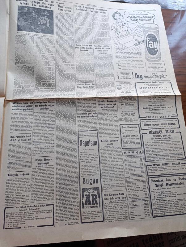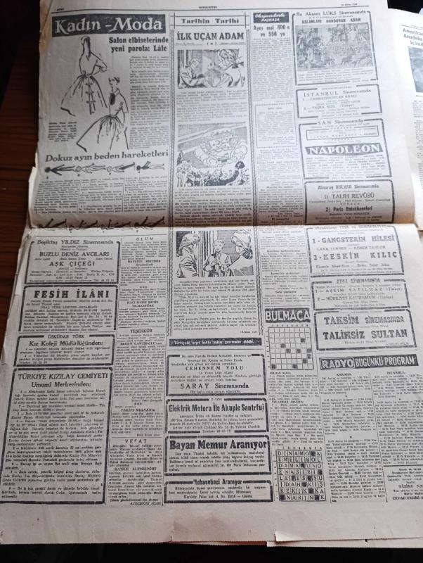 Cumhuriyet Gazetesi - 10 Ekim 1956 - Hürriyet Partisinin Lideri Fevzi Lütfi Karaosmanoğlu CHP'yi İtham Etti - Ticaret Bakanı Zeyyat Mandalinci Dün Gece Amerika'dan Geldi - Dinamo Takımı Fenerbahçe'nin Dolmabahçe Stadında Maçı Fotoğraf - Yunanlılar Sahillerimizdeki Bir Adayı Tahkim Etmeye Kalkıştılar - Kraliçe Süreyya Boşanmıyor - Memlekete Traktör Kaydıyla Giren Lüks Otomobil Fotoğraf- Ulubatlı Hasan Tatbikatı - Don Camillo'nun Küçük Alemi Yazan G. Guareschi Yazı Dizisi - Aşktan Da Üstün Yazan Elizabeth Gaskell Yazı Dizisi - Tramvaylar Tamamen Kaldırılmayacak - Oniki Adada Üsler Yazan Ömer Sami Coşar - Bir Haftada Sigara Bıraktıktan Hap - Rusya'da Çingeneler Kanun Dışı - Aslanları Durduran Adam Bu Akşam Lüks Sinemasında - Ankara İstanbul Radyosu Programı - Bulmaca - Napoleon Şan Sinemasında - Adalet İsrail'e Gidiyor - Beynelmilel Olimpiyat Komitesine Dört Türk Atletinin İsmi Verildi - Ekrem Koçak - Fahir Özgüder - Osman Coşgül, Yunus Nadi tarafından kaleme alınmıştır. Cumhuriyet Gazetesi - 10 Ekim 1956 - Hürriyet Partisinin Lideri Fevzi Lütfi Karaosmanoğlu CHP'yi İtham Etti - Ticaret Bakanı Zeyyat Mandalinci Dün Gece Amerika'dan Geldi - Dinamo Takımı Fenerbahçe'nin Dolmabahçe Stadında Maçı Fotoğraf - Yunanlılar Sahillerimizdeki Bir Adayı Tahkim Etmeye Kalkıştılar - Kraliçe Süreyya Boşanmıyor - Memlekete Traktör Kaydıyla Giren Lüks Otomobil Fotoğraf- Ulubatlı Hasan Tatbikatı - Don Camillo'nun Küçük Alemi Yazan G. Guareschi Yazı Dizisi - Aşktan Da Üstün Yazan Elizabeth Gaskell Yazı Dizisi - Tramvaylar Tamamen Kaldırılmayacak - Oniki Adada Üsler Yazan Ömer Sami Coşar - Bir Haftada Sigara Bıraktıktan Hap - Rusya'da Çingeneler Kanun Dışı - Aslanları Durduran Adam Bu Akşam Lüks Sinemasında - Ankara İstanbul Radyosu Programı - Bulmaca - Napoleon Şan Sinemasında - Adalet İsrail'e Gidiyor - Beynelmilel Olimpiyat Komitesine Dört Türk Atletinin İsmi Verildi - Ekrem Koçak - Fahir Özgüder - Osman Coşgül adlı eser Türkçe dilindedir.