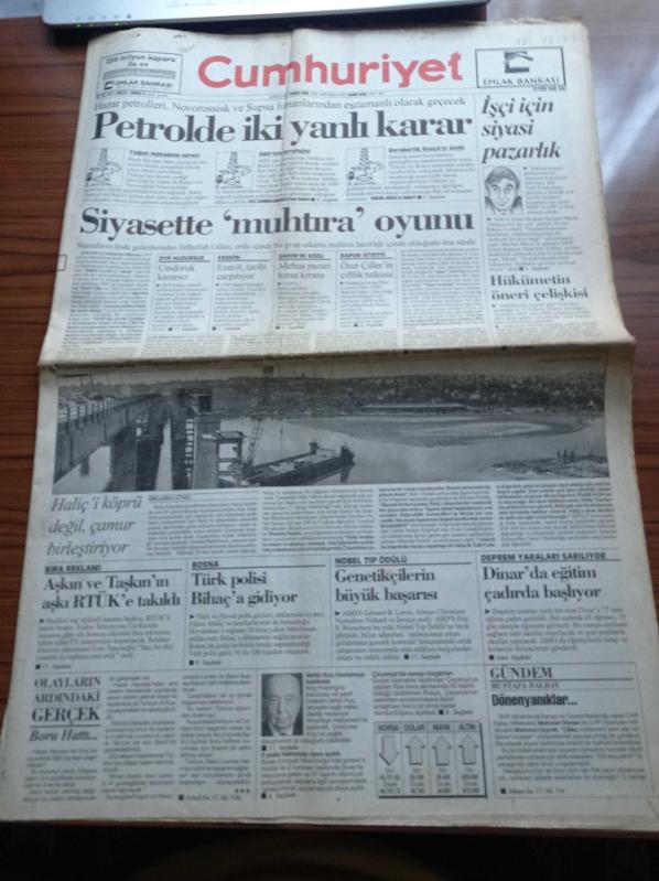 Cumhuriyet Gazetesi - 10 Ekim 1995 - Hakan Şükür Torino'dan Tekrar Galatasaray'a Döndü - Haliç'i Köprü Değil Çamur Birleştiriyor - Türk Polisi Bihaç'a Gidiyor - Genetikçilerin Büyük Başarısı - Hazar Petrolleri Novorossisk Ve Supsa Limanlarından Eşzamanlı Olarak Geçecek - Nurcuların Önde Gelenlerinden Fethullah Gülen Bir Grup Askerin Muhtıra Hazırlığı İçinde Olduğunu Öne Sürdü adlı eser, Kitap > Süreli Yayınlar > Gazeteler kategorisinde İkinci El olarak satıştadır.
