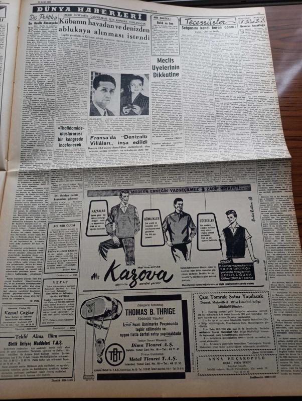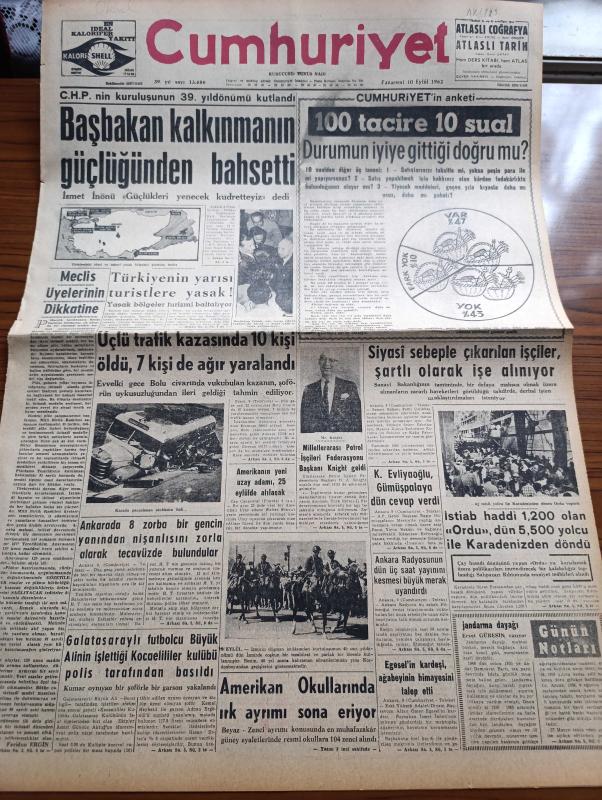 Cumhuriyet Gazetesi - 10 Eylül 1962 - Meclis Üyelerinin Dikkatine Yazan Feridun Ergin Köşe Yazısı - Başbakan İsmet İnönü Kalkınmanın Güçlüğünden Bahsetti - Cumhuriyetin Anketi 100 Tacire 10 Sual Durumun İyiye Gittiği Doğru Mu - Amerika'nın Yeni Uzay Adamı Walter Shirra 25 Eylül'de Atılacak - Galatasaraylı Futbolcu Ali Beratlıgil'in İşlettiği Kocaelililer Kulübü Polis Tarafından Basıldı - Amerikan Okullarında Irk Ayrımı Sona Eriyor - Yer Demir Gök Bakır Yazan Yaşar Kemal Yazı Dizisi - Türkiye'de Sosyalizminin İlkeleri Yazan İlhan Selçuk Köşe Yazısı - Küba'nın Havadan Ve Denizden Ablukaya Alınması İstendi - Fransa'da Denizaltı Villaları İnşa Edildi - Osmanlı Tarihinde Haydut Aşkları Yazan Reşat Ekrem Koçu Yazı Dizisi - Bay Oscar Karikatür - Profesör Nümbüs'ün Maceraları Çizgi Roman - Gecenin Ucundaki Işık Yazan Peride Celal Yazı Dizisi - Galatasaray Bükreşte Galibiyeti Haksız Bir Penaltı Golü İle Kaçırdı - Beşiktaş Vefa'yı Bozguna Uğrattı - Fenerbahçe Galatasaray'ı 68 60 Mağlup Etti, Yunus Nadi tarafından kaleme alınmıştır. Cumhuriyet Gazetesi - 10 Eylül 1962 - Meclis Üyelerinin Dikkatine Yazan Feridun Ergin Köşe Yazısı - Başbakan İsmet İnönü Kalkınmanın Güçlüğünden Bahsetti - Cumhuriyetin Anketi 100 Tacire 10 Sual Durumun İyiye Gittiği Doğru Mu - Amerika'nın Yeni Uzay Adamı Walter Shirra 25 Eylül'de Atılacak - Galatasaraylı Futbolcu Ali Beratlıgil'in İşlettiği Kocaelililer Kulübü Polis Tarafından Basıldı - Amerikan Okullarında Irk Ayrımı Sona Eriyor - Yer Demir Gök Bakır Yazan Yaşar Kemal Yazı Dizisi - Türkiye'de Sosyalizminin İlkeleri Yazan İlhan Selçuk Köşe Yazısı - Küba'nın Havadan Ve Denizden Ablukaya Alınması İstendi - Fransa'da Denizaltı Villaları İnşa Edildi - Osmanlı Tarihinde Haydut Aşkları Yazan Reşat Ekrem Koçu Yazı Dizisi - Bay Oscar Karikatür - Profesör Nümbüs'ün Maceraları Çizgi Roman - Gecenin Ucundaki Işık Yazan Peride Celal Yazı Dizisi - Galatasaray Bükreşte Galibiyeti Haksız Bir Penaltı Golü İle Kaçırdı - Beşiktaş Vefa'yı Bozguna Uğrattı - Fenerbahçe Galatasaray'ı 68 60 Mağlup Etti adlı eser Türkçe dilindedir.
