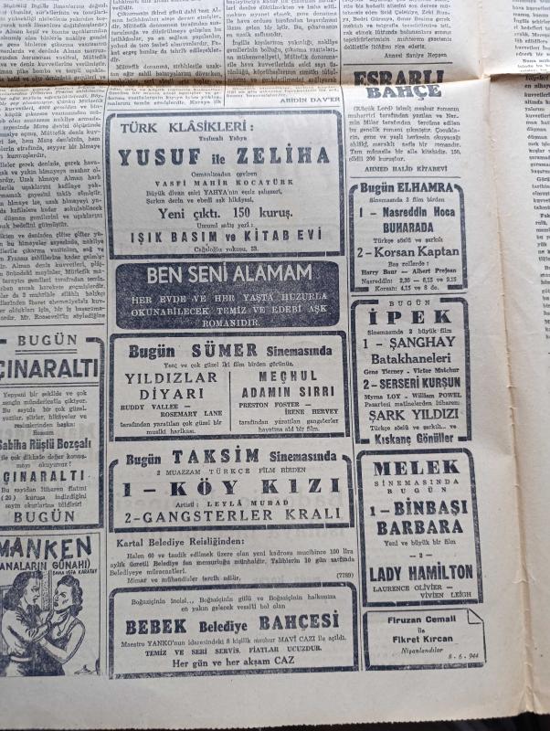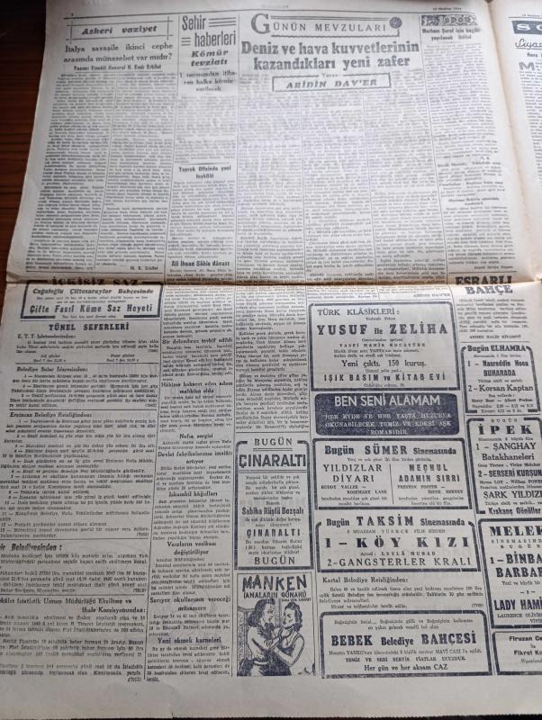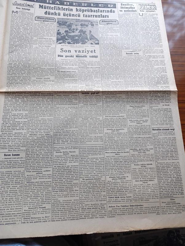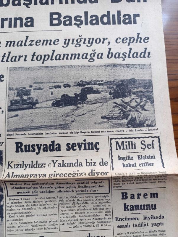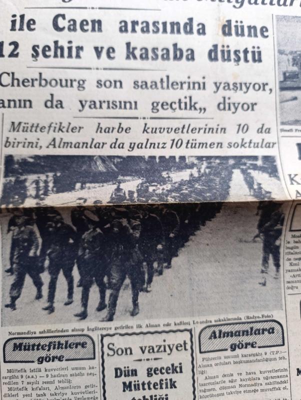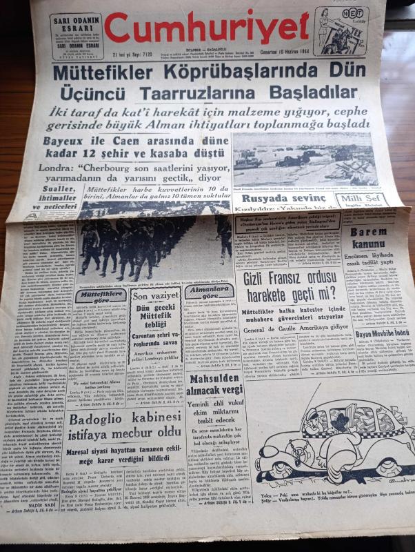 Cumhuriyet Gazetesi - 10 Haziran 1944 - Sualler İhtimaller ve Neticeleri Yazan Nadir Nadi Köşe Yazısı - Müttefikler Köprübaşlarında Dün Üçüncü Taarruzlarına Başladılar - Bayeux İle Caen Arasında Düne Kadar 12 Şehir Ve Kasaba Düştü - Şimali Fransa'da Amerikalılar Tarafından Kurulan Bir Köprübaşının Umumî Manzarası - Barem Kanunu - Mahsulden Alınacak Vergi - Cemal Nadir Karikatür - Bayan Mevhibe İnönü - Gizli Fransız Ordusu Harekete Geçti Mi - General De Gaulle Amerika'ya Gidiyor - Askeri Vaziyet Yazan Emekli General H. Emir Erkilet Yazı Dizisi - Ali İhsan Sabis Davası - 1 Temmuzdan İtibaren Halka Kömür Verilecek - Beşiktaşlı Merhum Şeref İçin Anma - Nasreddin Hoca Buharada Bugün Elhamra - Binbaşı Barbara Melek Sinemasında - Hava Üstünlüğü Yazan Ömer Rıza Doğrul Köşe Yazısı - Neden Sinirlenirim Yazan Burhan Felek Köşe Yazısı - Japon Başvekili Hideki Tojo'nun Hitler'e Telgrafı - Mualla Gökçay Ve Hamiyet Yüceses Sarayburnu Park Gazinosunda - Belvü Fenerbahçe Açıktır -Bugünkü Radyo Programı, Yunus Nadi tarafından kaleme alınmıştır. Cumhuriyet Gazetesi - 10 Haziran 1944 - Sualler İhtimaller ve Neticeleri Yazan Nadir Nadi Köşe Yazısı - Müttefikler Köprübaşlarında Dün Üçüncü Taarruzlarına Başladılar - Bayeux İle Caen Arasında Düne Kadar 12 Şehir Ve Kasaba Düştü - Şimali Fransa'da Amerikalılar Tarafından Kurulan Bir Köprübaşının Umumî Manzarası - Barem Kanunu - Mahsulden Alınacak Vergi - Cemal Nadir Karikatür - Bayan Mevhibe İnönü - Gizli Fransız Ordusu Harekete Geçti Mi - General De Gaulle Amerika'ya Gidiyor - Askeri Vaziyet Yazan Emekli General H. Emir Erkilet Yazı Dizisi - Ali İhsan Sabis Davası - 1 Temmuzdan İtibaren Halka Kömür Verilecek - Beşiktaşlı Merhum Şeref İçin Anma - Nasreddin Hoca Buharada Bugün Elhamra - Binbaşı Barbara Melek Sinemasında - Hava Üstünlüğü Yazan Ömer Rıza Doğrul Köşe Yazısı - Neden Sinirlenirim Yazan Burhan Felek Köşe Yazısı - Japon Başvekili Hideki Tojo'nun Hitler'e Telgrafı - Mualla Gökçay Ve Hamiyet Yüceses Sarayburnu Park Gazinosunda - Belvü Fenerbahçe Açıktır -Bugünkü Radyo Programı adlı eser Türkçe dilindedir.