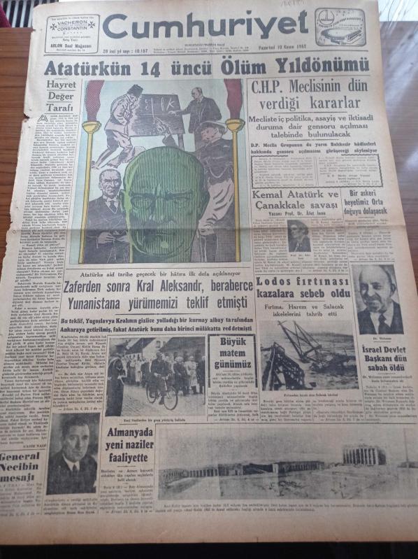 Cumhuriyet Gazetesi - 10 Kasım 1952 - Atatürk'ün 14. Ölüm Yıldönümünü - Yazan Profesör Doktor Afet İnan Kemal Atatürk ve Çanakkale Savaşı - Atatürk'e Aid Tarihe Geçecek Bir Hatıra İlk Defa Açıklanıyor - Hasan Rıza Soyak - Zaferden Sonra Kral Aleksandr Beraberce Yunanistan'a Yürümemizi Teklif Etmişti - İsrail Devlet Başkanı Dr. Weizman Dün Sabah Öldü - Almanya'da Yeni Naziler Faaliyette - Anıtkabir İnşaatı 1953 Yılında Tamamlanacak - Hasan Ali Yücel Atatürkçülük Köşe Yazısı - Dr. Asım Arar - Atatürk'ün Geçirmiş Olduğu Hastalıklara Dair Hatıralar - Amerika İşçi Liderlerinden Murray Öldü - Kıbrıs Türk Lisesinde Kızıl Propaganda - Napoli Ankara Boks Maçları - Galatasaray Beşiktaş' Berabere Kaldı - Tarihte Türk Mimarisi - Stalin'in Gizli Harp Planları - Siemens - Chemol Yağları - Ericsson Elektrik Sayaçları - Gripin - Prestige Düdüklü Tencereleri, Yunus Nadi tarafından kaleme alınmıştır. Cumhuriyet Gazetesi - 10 Kasım 1952 - Atatürk'ün 14. Ölüm Yıldönümünü - Yazan Profesör Doktor Afet İnan Kemal Atatürk ve Çanakkale Savaşı - Atatürk'e Aid Tarihe Geçecek Bir Hatıra İlk Defa Açıklanıyor - Hasan Rıza Soyak - Zaferden Sonra Kral Aleksandr Beraberce Yunanistan'a Yürümemizi Teklif Etmişti - İsrail Devlet Başkanı Dr. Weizman Dün Sabah Öldü - Almanya'da Yeni Naziler Faaliyette - Anıtkabir İnşaatı 1953 Yılında Tamamlanacak - Hasan Ali Yücel Atatürkçülük Köşe Yazısı - Dr. Asım Arar - Atatürk'ün Geçirmiş Olduğu Hastalıklara Dair Hatıralar - Amerika İşçi Liderlerinden Murray Öldü - Kıbrıs Türk Lisesinde Kızıl Propaganda - Napoli Ankara Boks Maçları - Galatasaray Beşiktaş' Berabere Kaldı - Tarihte Türk Mimarisi - Stalin'in Gizli Harp Planları - Siemens - Chemol Yağları - Ericsson Elektrik Sayaçları - Gripin - Prestige Düdüklü Tencereleri adlı eser Türkçe dilindedir.