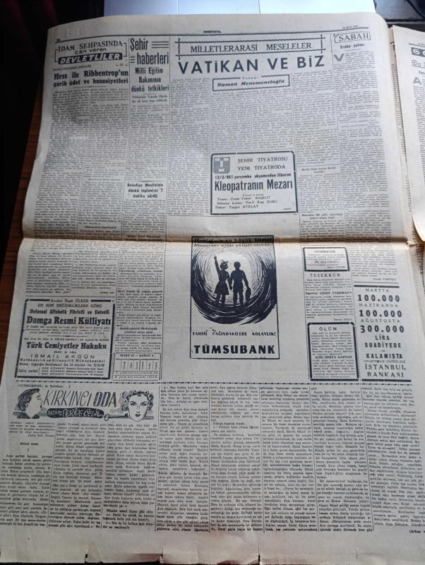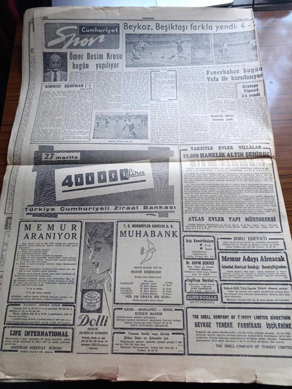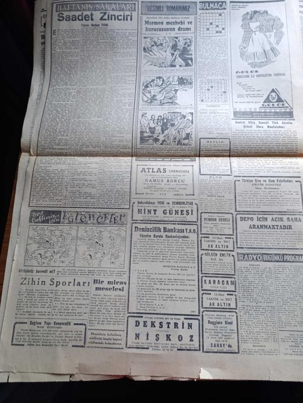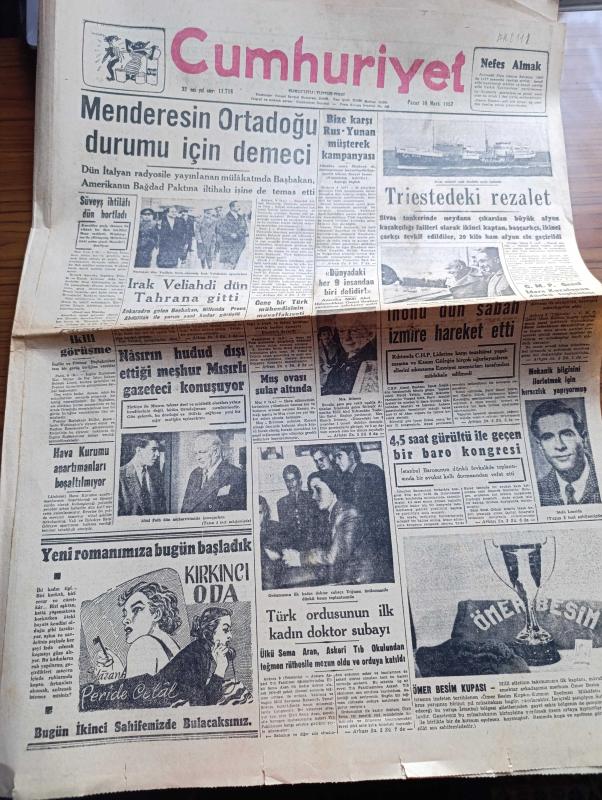 Cumhuriyet Gazetesi - 10 Mart 1957 - Adnan Menderes'in Ortadoğu Durumu İçin Demeci - İran Veliahdı Abdülillah Dün Tahran'a Gitti - Sivas Tankerinde Ortaya Çıkarılan Afyon Kaçakçılığı - Bize Karşı Rus Yunan Müşterek Kampanyası - İsmet İnönü Dün Sabah İzmir'e Harekete Geçti - Türk Ordusunun İlk Kadın Doktor Subayı Ülkü Sema Aran- Vatikan Ve Biz Yazan Numan Menemencioğlu Köşe Yazısı - İdam Sehpasında Can Veren Devletliler Yazan Cemalettin Saraçoğlu Yazı Dizisi - Kırkıncı Oda Yazan Peride Celal Yazı Dizisi - Amerikan Başkanı Eisenhower'in Ortadoğu Planı Fiilen Yürürlüğe Girdi - Dram Tiyatrosunun Büfecisi Stelyo Vefat Etti - Turing Ve Otomobil Kurumunun Kongresi - Haftanın Şakaları Yazan Burhan Felek - Hint Güneşi Şehzadebaşı ve Çemberlitaş Sinemasında - Namus Borcu Filmi Atlas Sinemasında - Resimli Romanımız Mormon Mezhebi Ve Kurucusunun Dramı - Fenerbahçe Bugün Vefa İle Karşılaşıyor - Beykoz Beşiktaş'ı Farkla Yendi - Ömer Besim Krosu Bugün Yapılıyor - Göztepe Ujpesti 2 1 Yendi- Muhabank adlı eser, Kitap > Süreli Yayınlar > Gazeteler > Türkiye > Genel > Günlük kategorisinde İkinci El olarak satıştadır.